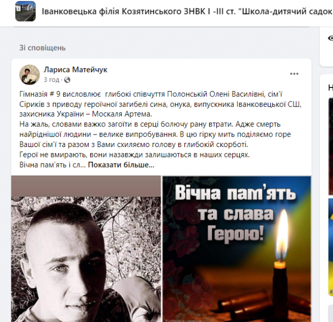 — Козятинська гімназія № 9 висловлює глибокі співчуття Олені Полонській, сім’ї Сіриків з приводу героїчної загибелі сина, онука, випускника Іванковецької школи, захисника України — Артема Москаля. На жаль, словами важко загоїти в серці болючу рану втрати. Адже смерть найріднішої людини — велике випробування. В цю гірку мить поділяємо горе Вашої сім’ї та разом з Вами схиляємо голову в глибокій скорботі, — написали на сторінці Іванковецька філія Козятинського ЗНВК І -ІІІ ст.«Школа-дитячий садок» №9.