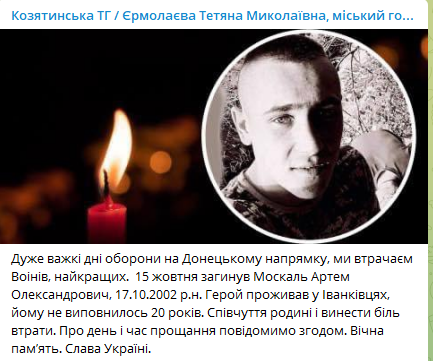 - Сьогодні, 15 жовтня ввечері стало відомо, що на війні загинув наш земляк, мешканець Іванківців Артем Москаль