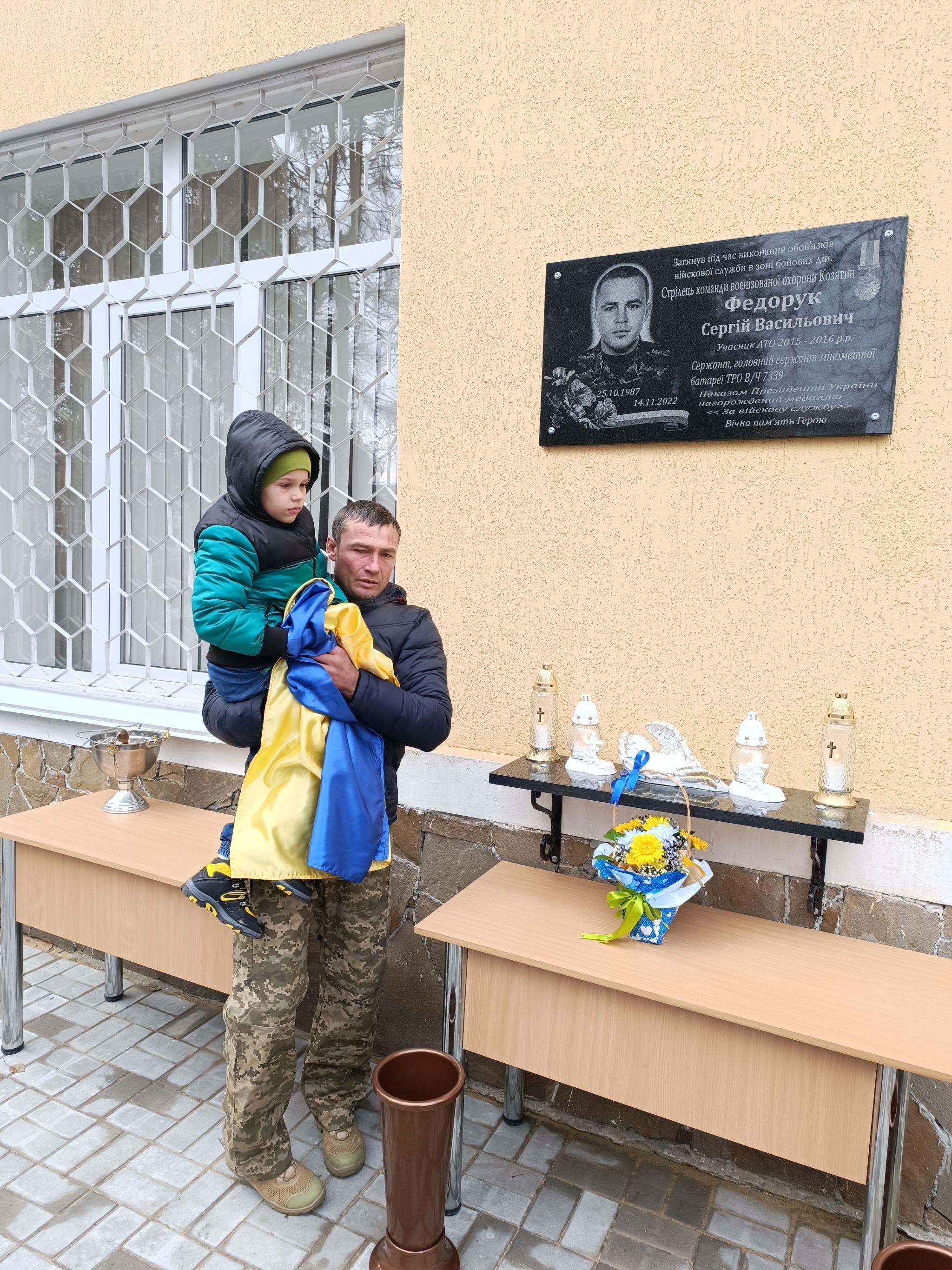 Почесне право відкрити меморіальну дошку Сергію Федоруку надали сину Назару та рідному брату Вадиму Федоруку. Маленькі рученята торкаються українського прапора, а під ним — викарбований на граніті портрет татуся-Героя. До сліз…