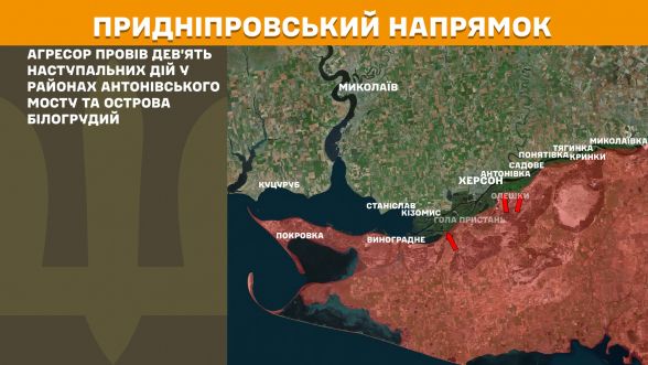 - Придніпровський напрямок: Агресор провів дев'ять наступальних дій у районах Антонівського мосту та острова Білогрудий.