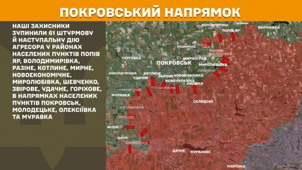 - Покровський напрямок: Наші захисники зупинили 61 штурмову й наступальну дію агресора у низці населених пунктів.