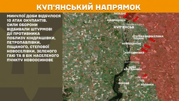 - Куп’янський напрямок: 10 атак окупантів. Сили оборони відбивали штурмові дії поблизу Кіндрашівки, Петропавлівки, Піщаного, Степової Новоселівки, Зеленого Гаю та у бік Новоосинового.