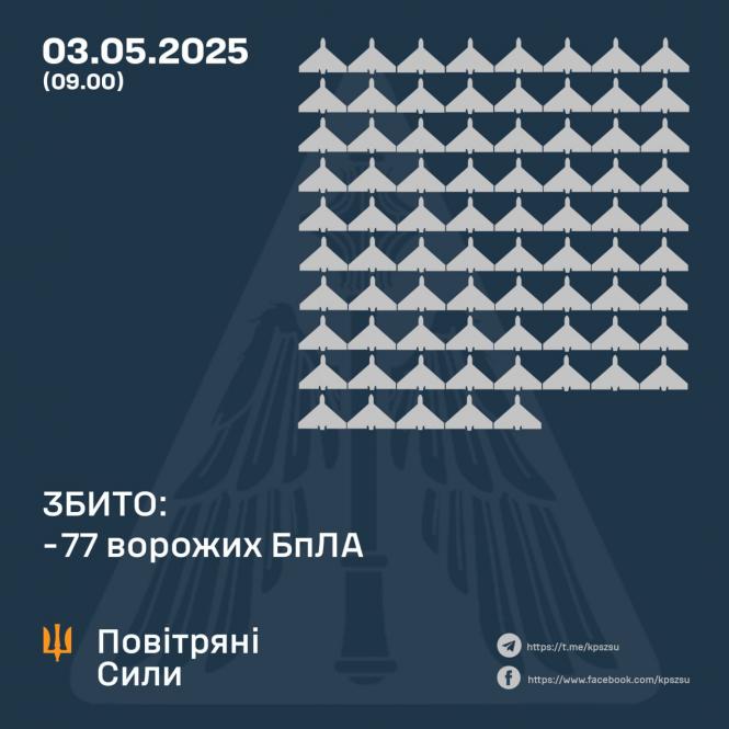 Станом на ранок підтвердили збиття 77 ударних БпЛА типу Shahed (безпілотників інших типів) на сході, півночі, півдні та в центрі країни. 73 ворожі безпілотники-імітатори — локаційно втрачені (без негативних наслідків).