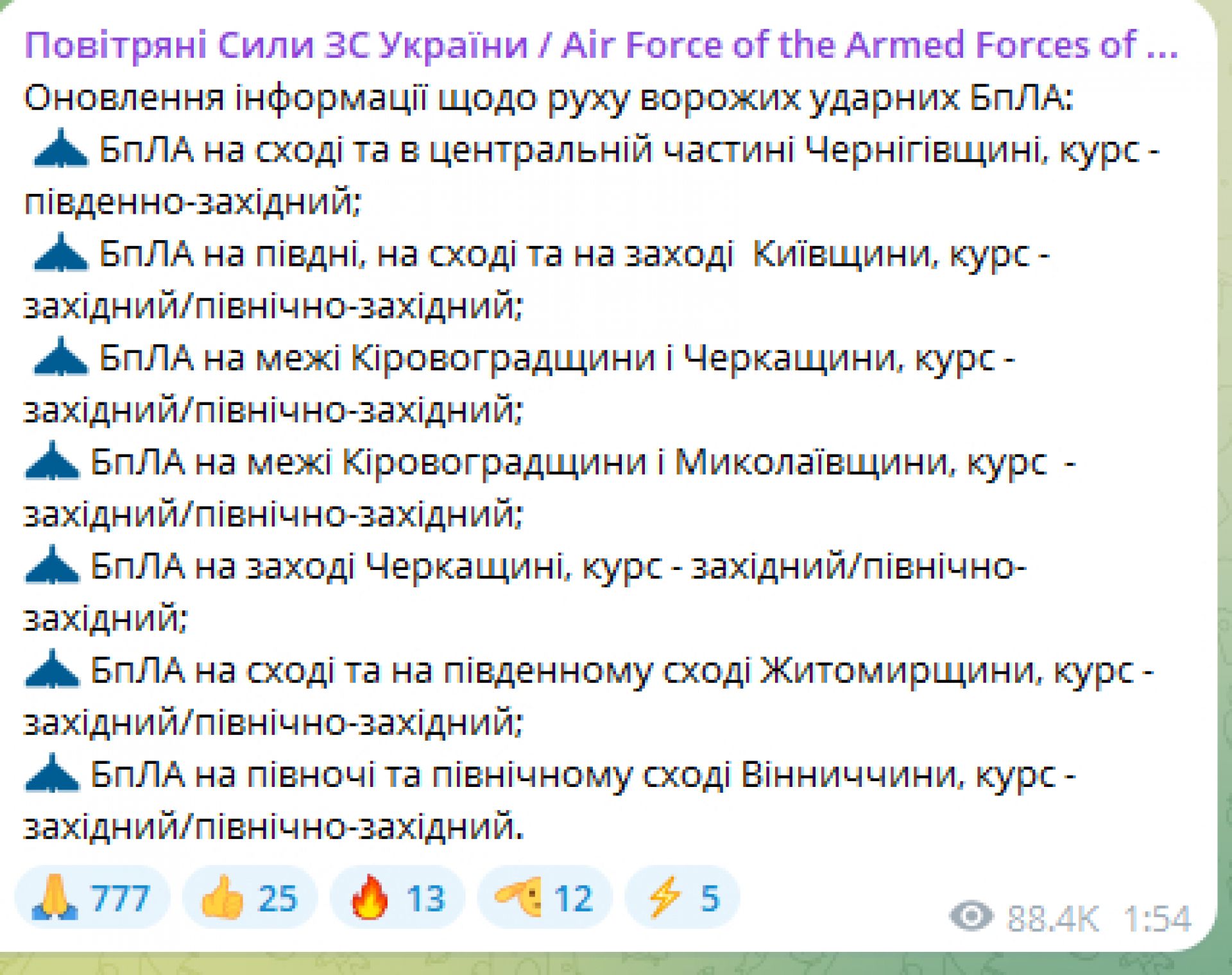 45 ворожих безпілотників-імітаторів — локаційно втрачені (без негативних наслідків).