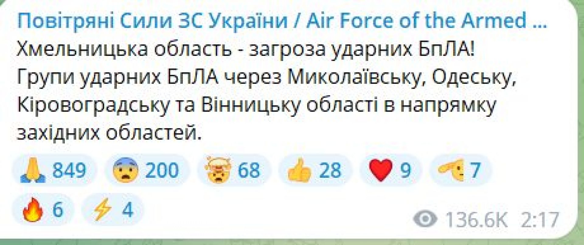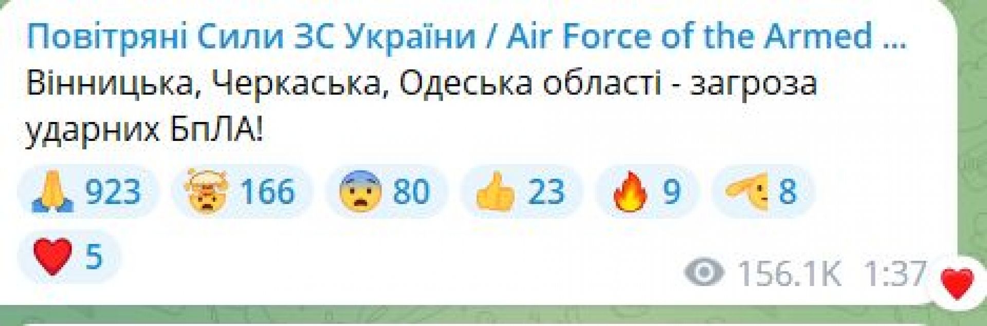 - Летіло вороже залізяччя і через нашу область. Повітряна тривога тривала з 1:39 до 5:04 ранку.