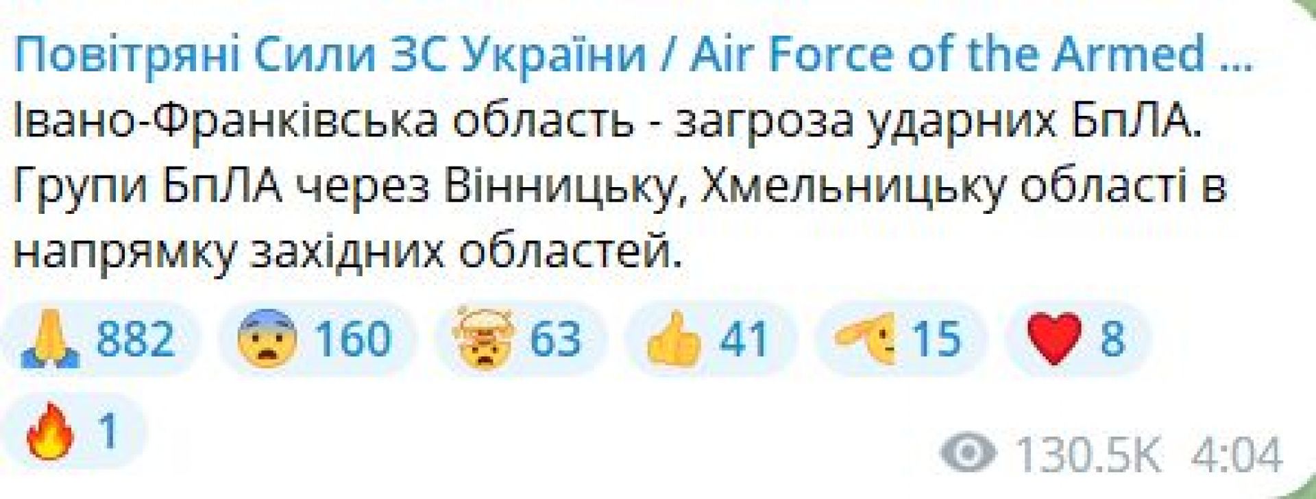 Як повідомили вранці Повітряні Сили ЗСУ, усього зафіксовали пуски 30 ударних БпЛА з південно-східного напрямку (Приморсько-Ахтарськ – рф), а також одну балістичну ракету «Іскандер-М», яку противник випустив з території тимчасово окупованого Криму у напрямку Кривого Рогу.