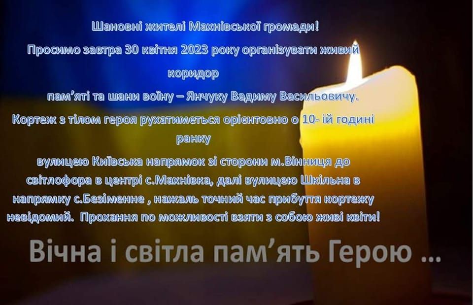 — Страшна звістка прийшла у нашу громаду: у бою за Україну поліг молодий воїн-захисник Янчук Вадим Васильович. Світла людина, щирий друг, привітний, добрий односельчанин, відважний, мужній, сильний і сміливий воїн. На віки-вічні його ім’я буде вписане в історію нашої громади, — написали односельчани, висловлюючи безмежну вдячність земляку-Герою за подвиг в ім’я незалежності нашої країни, — написали наші колеги у ФБ
