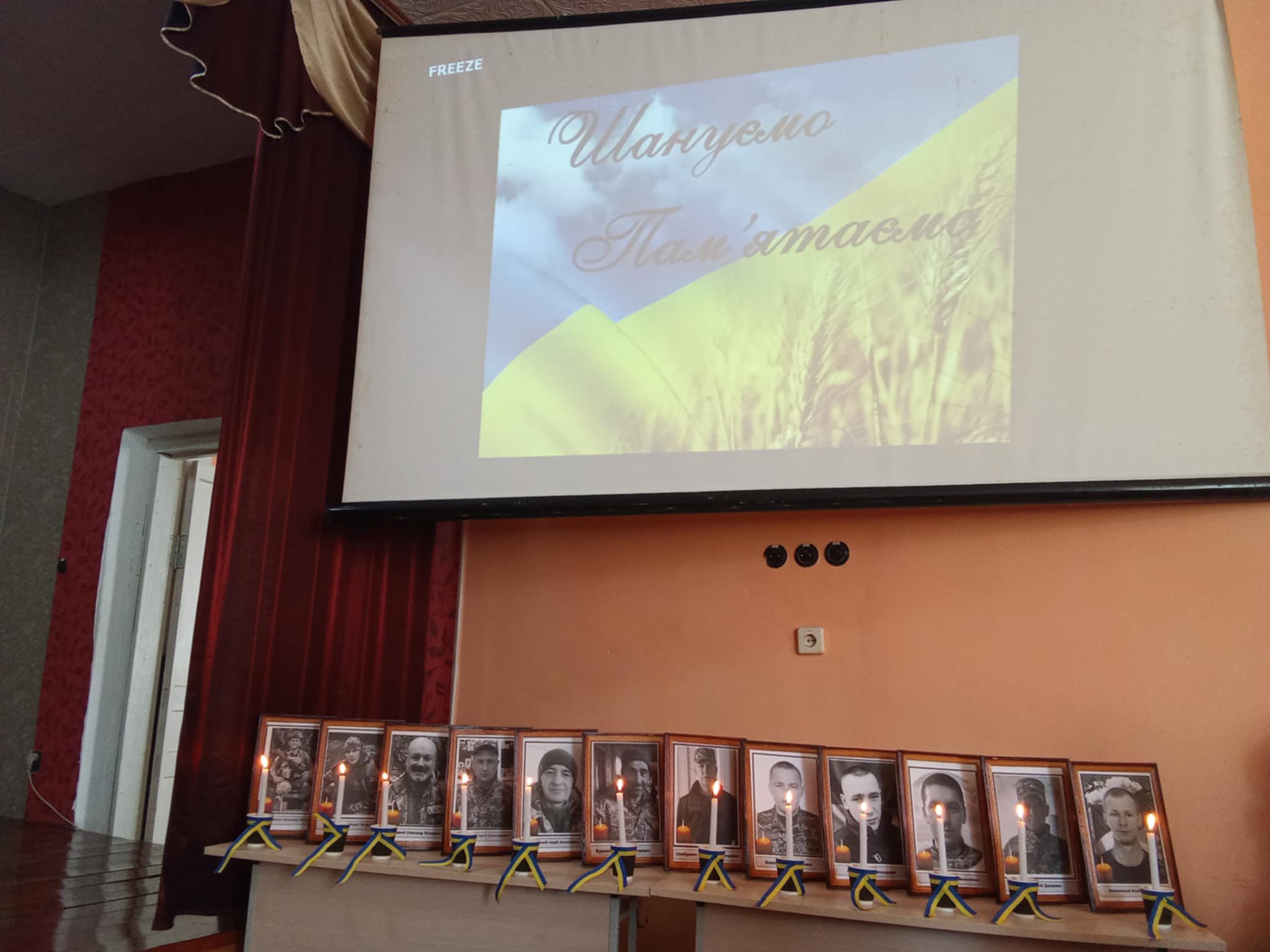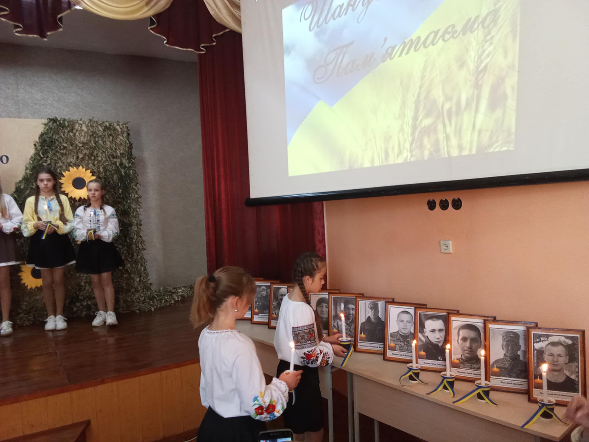 Прозвучав Гімн України і на сцену, тримаючи в руках запалені свічки, вийшли 12 учнів. Після хвилини мовчання вони спустилися до зали і поставили свічки біля портретів загиблих воїнів.