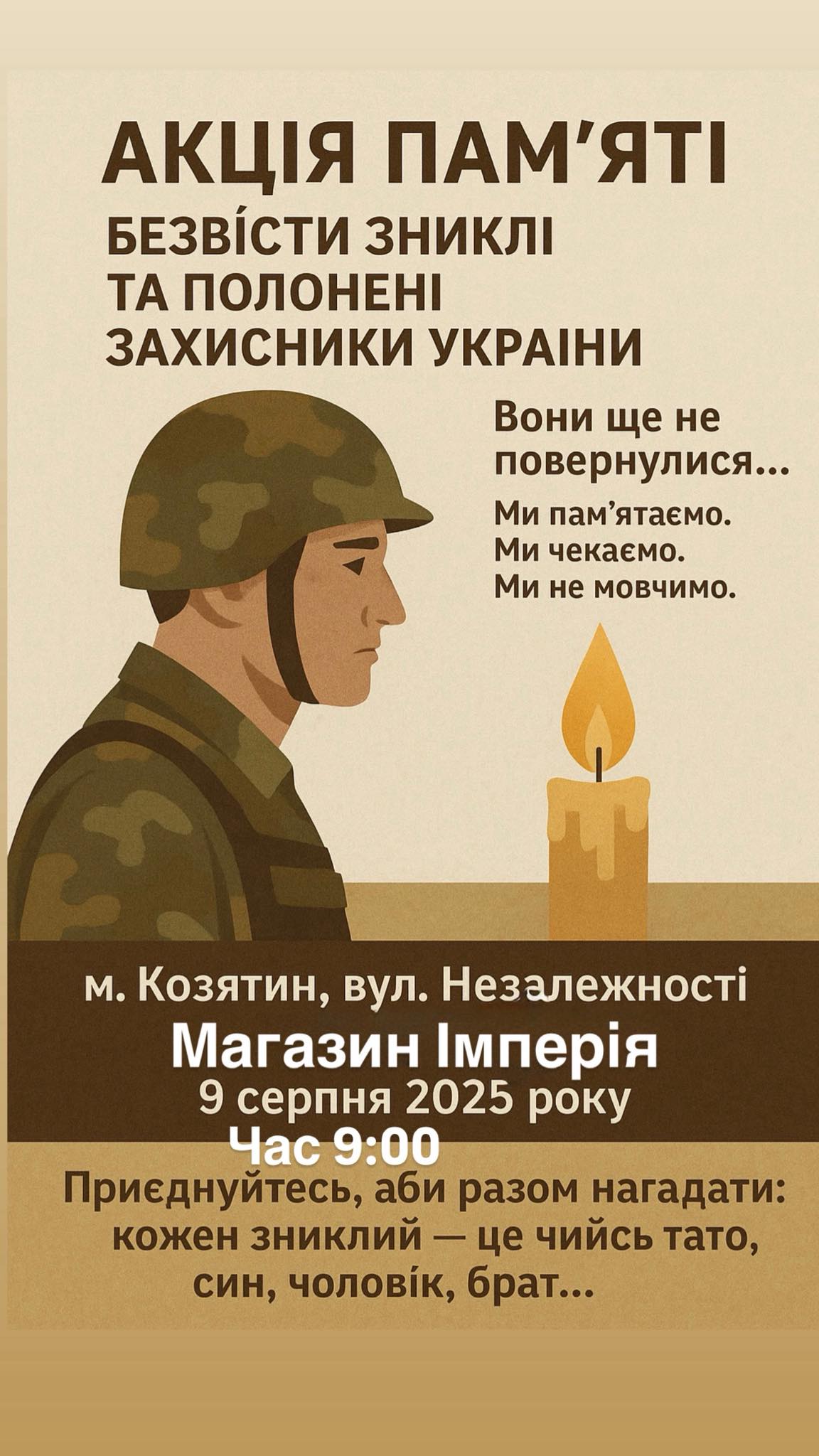 — Вони ще не повернулися… Ми памʼятаємо. Ми чекаємо. Ми не мовчимо. Приєднуйтесь, аби разом нагадати: кожен зниклий — це чиїйсь тато, син, чоловік, брат… — йдеться у дописі Тетяни.