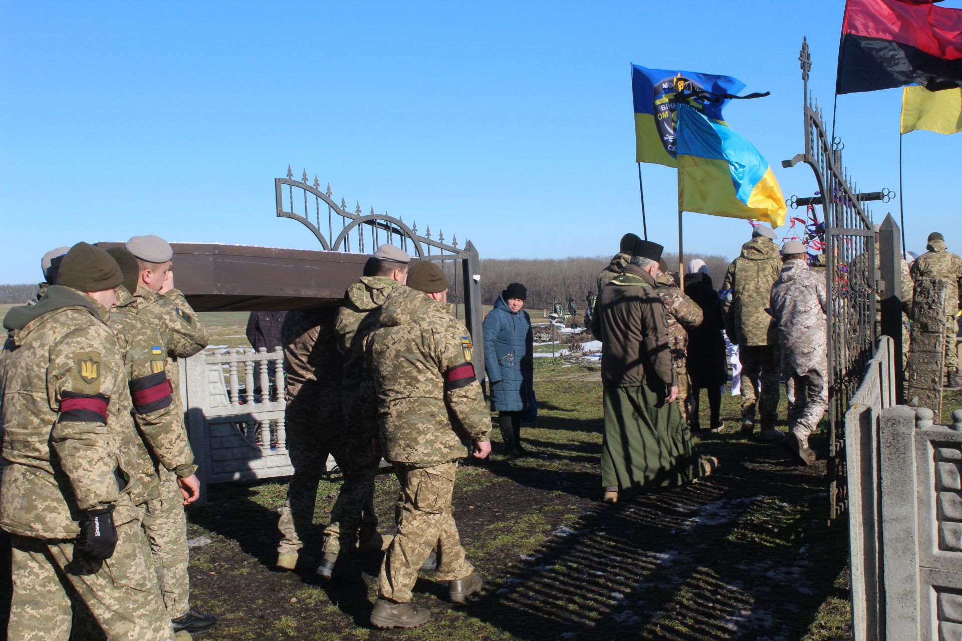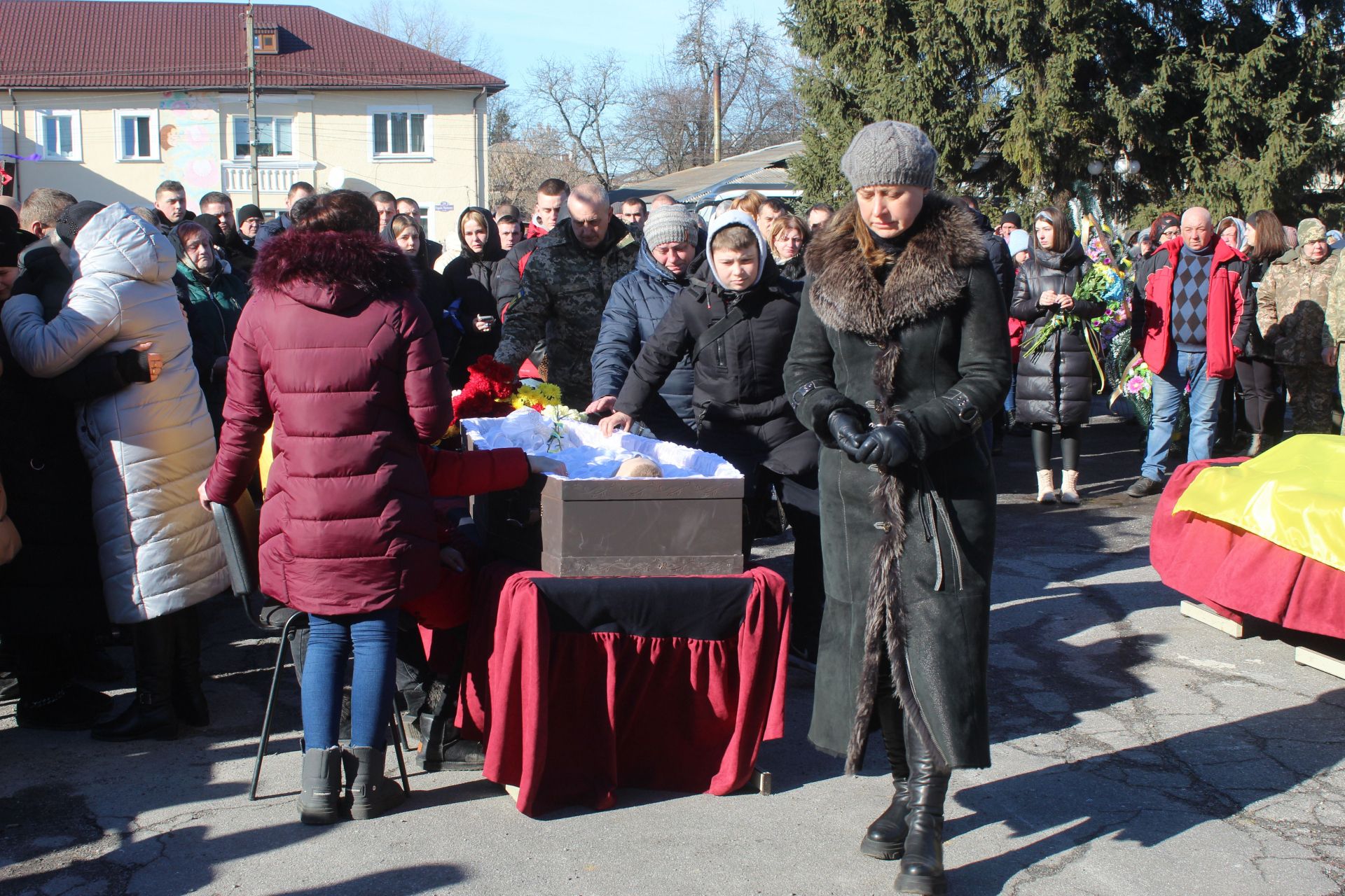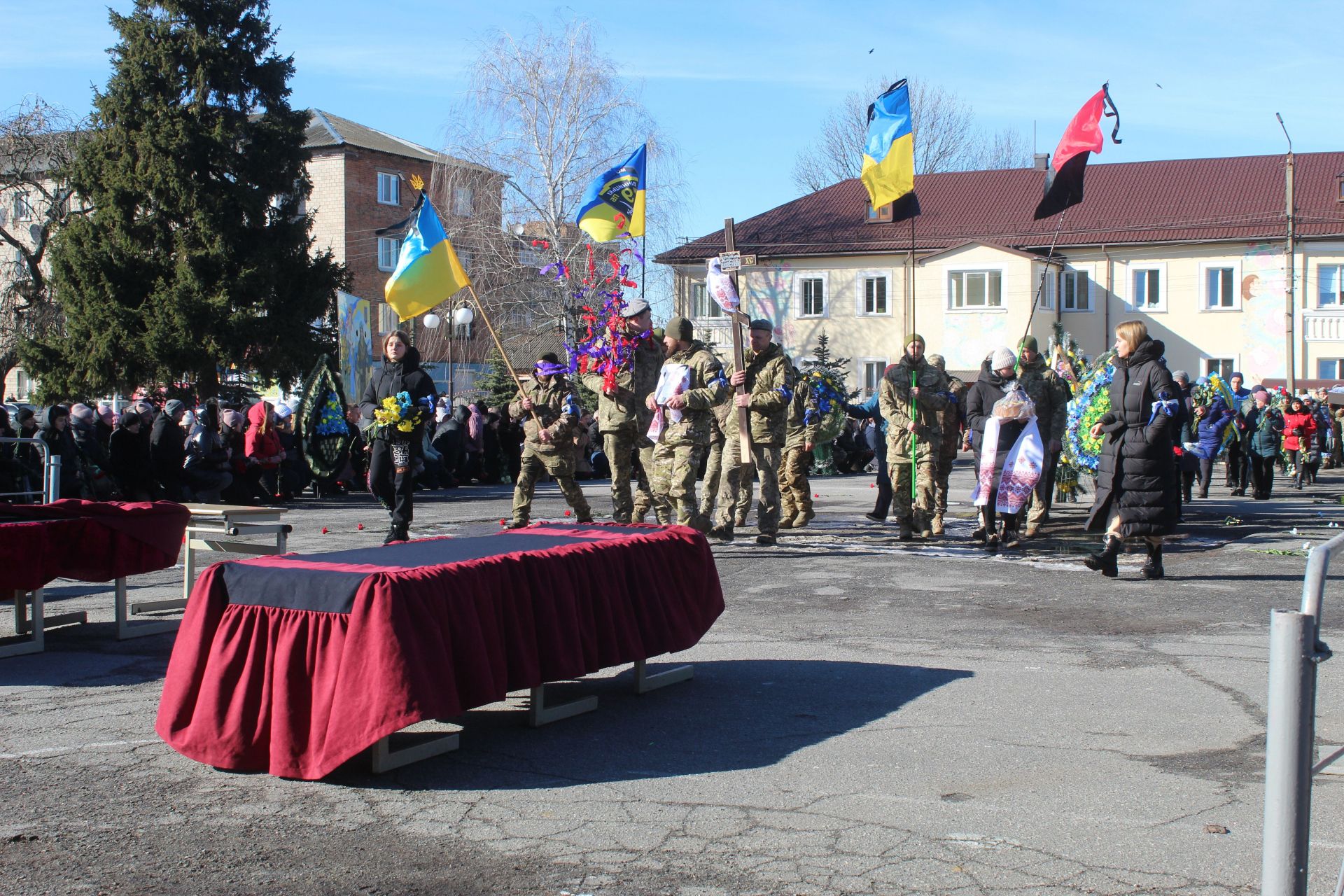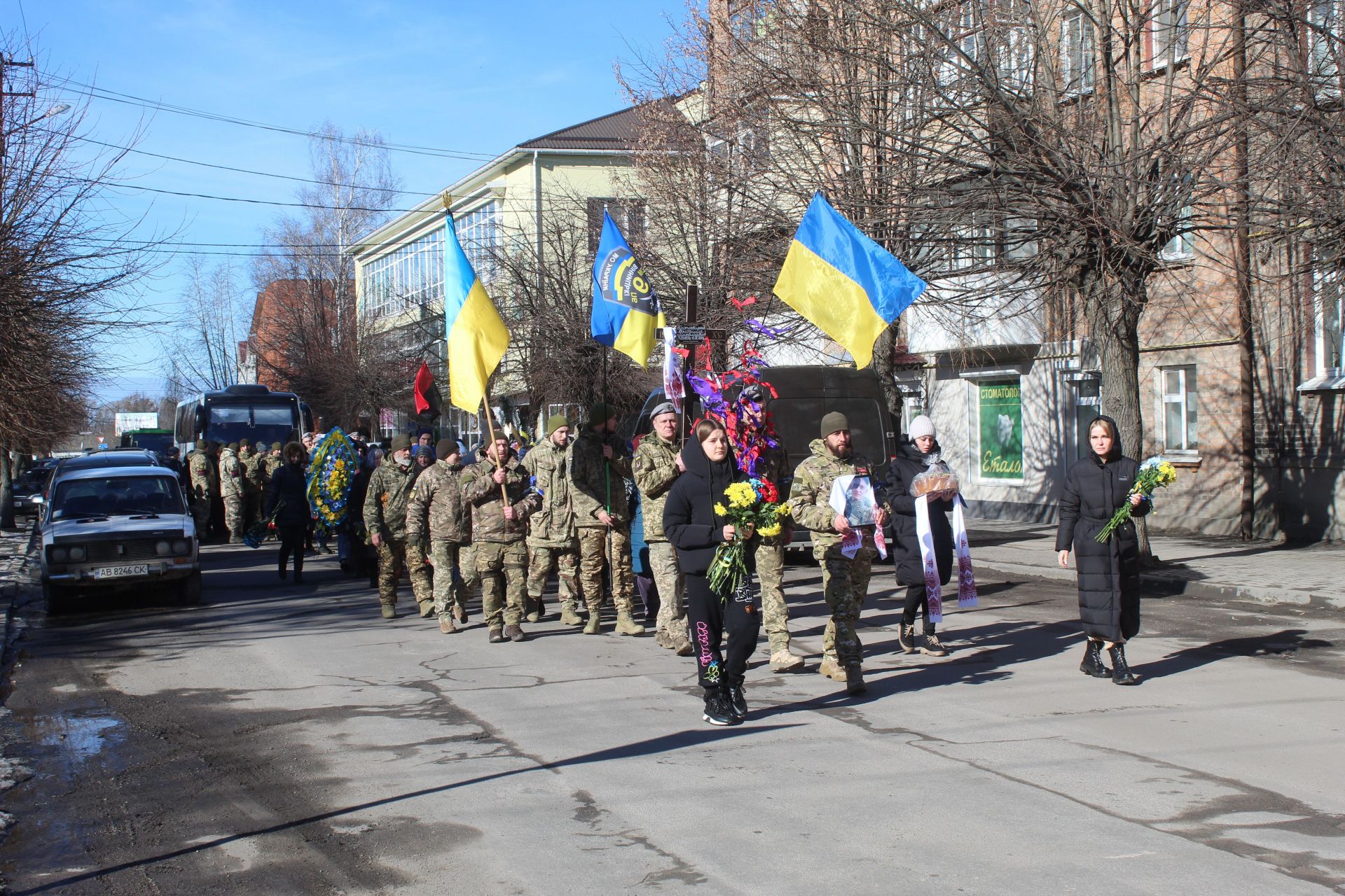 Ще священик проводив заупокійну панахиду, а на дворі вже стала формуватися траурна колона. В її голові — портрет воїна, прапор Вінницьких скіфів, червоно-чорний стяг, коровай, гілка черешні з стрічками, бо захисни був неодруженим. Далі йшли дівчата з оберемками живих квітів.