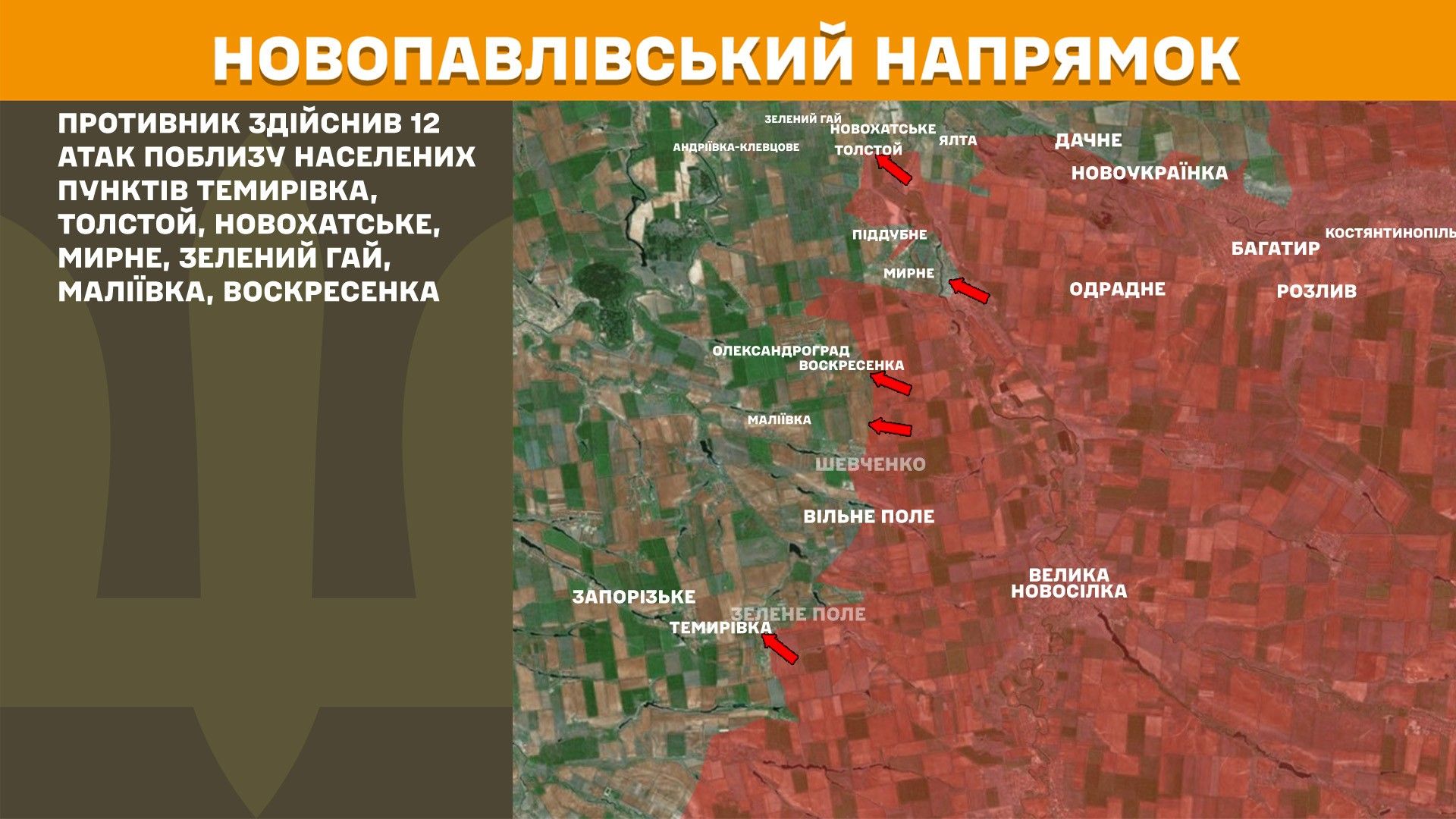 Новопавлівський: Противник здійснив 12 атак поблизу Темирівки, Толстого, Новохатського, Мирного, Зеленого Гаю, Маліївки, Воскресенки.