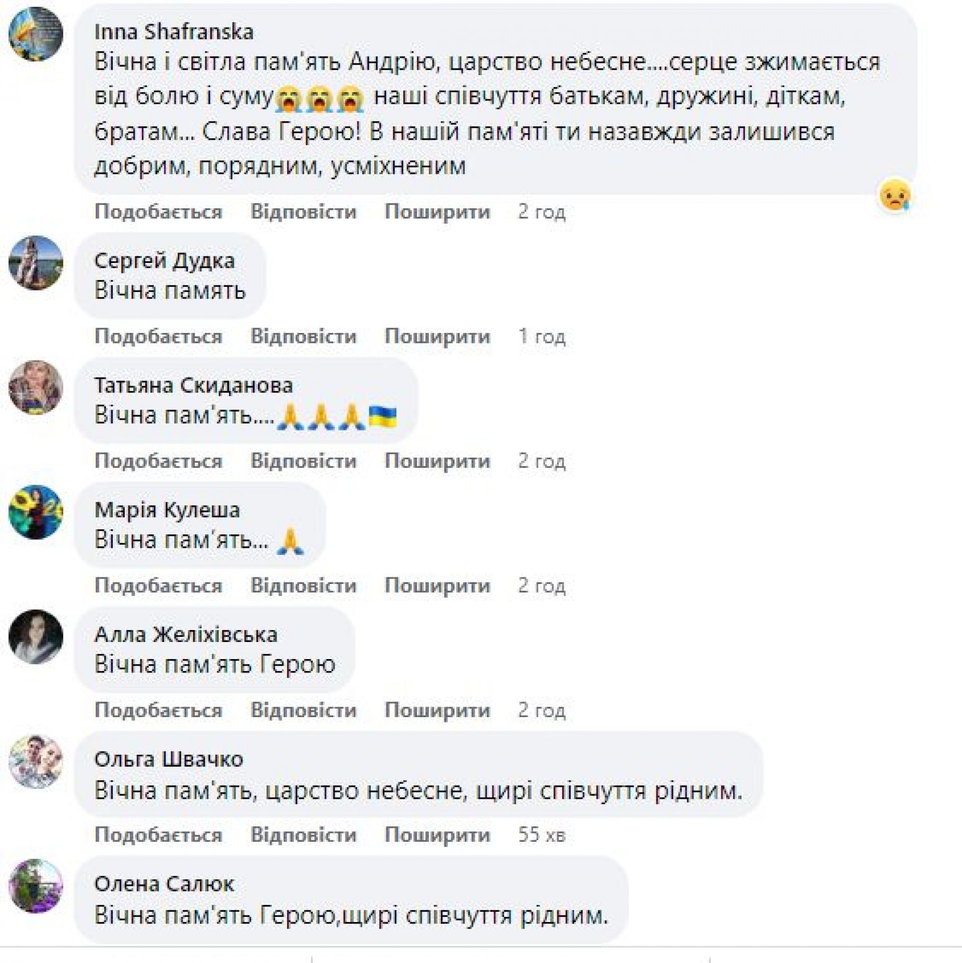 — Андрій був мужнім воїном і патріотом, з перших днів війни пішов боронити свою сім'ю, свою Батьківщину і нас з вами. А ще він був найкращим сином, чоловіком, батьком та другом, був найсвітлішою людиною. Справедливий, добрий, врівноважений, спокійний. Його друзі та знайомі пам'ятатимуть його життєрадісним та усміхненим. Таким він був завжди, — йдеться у повідомленні