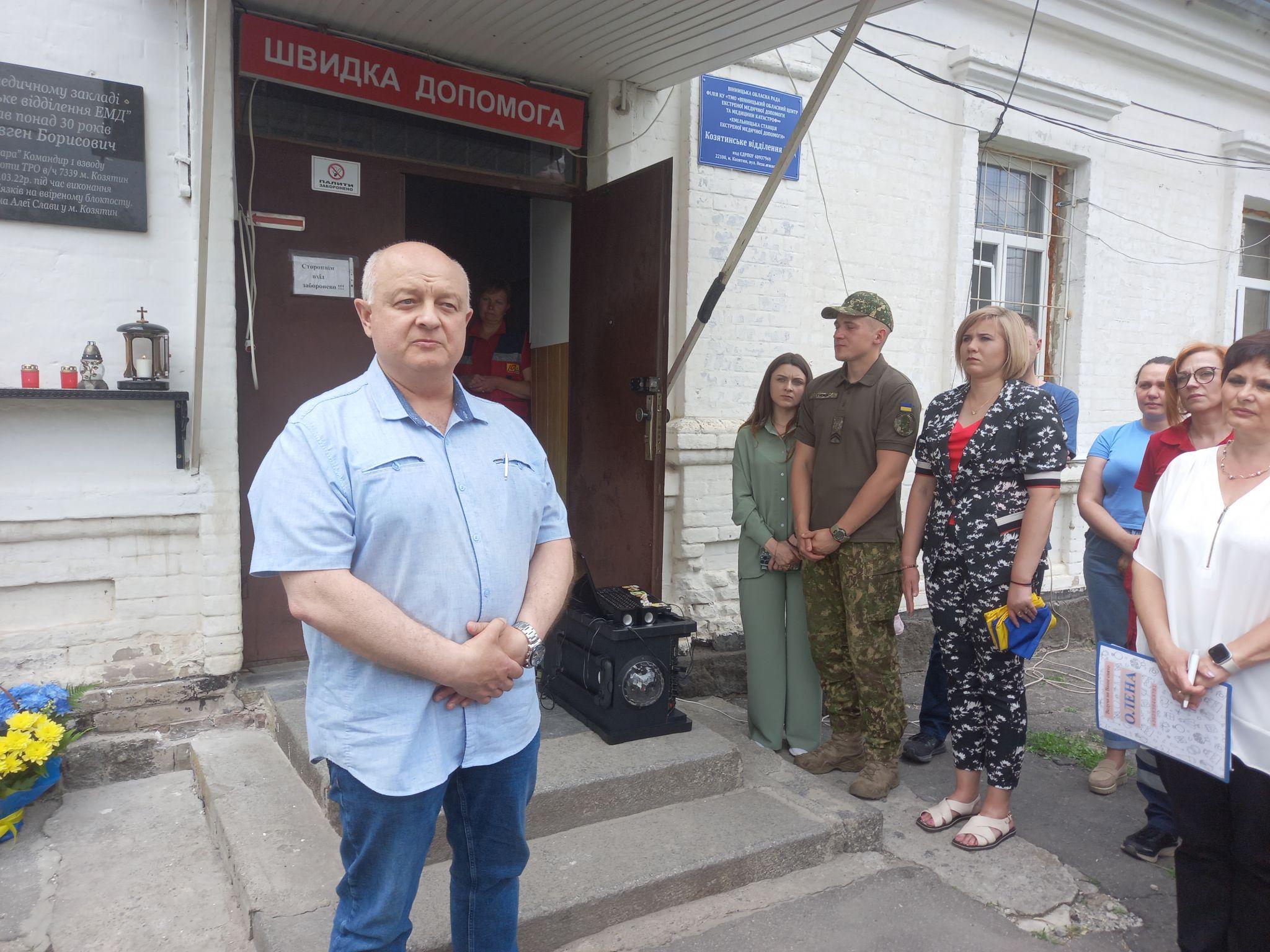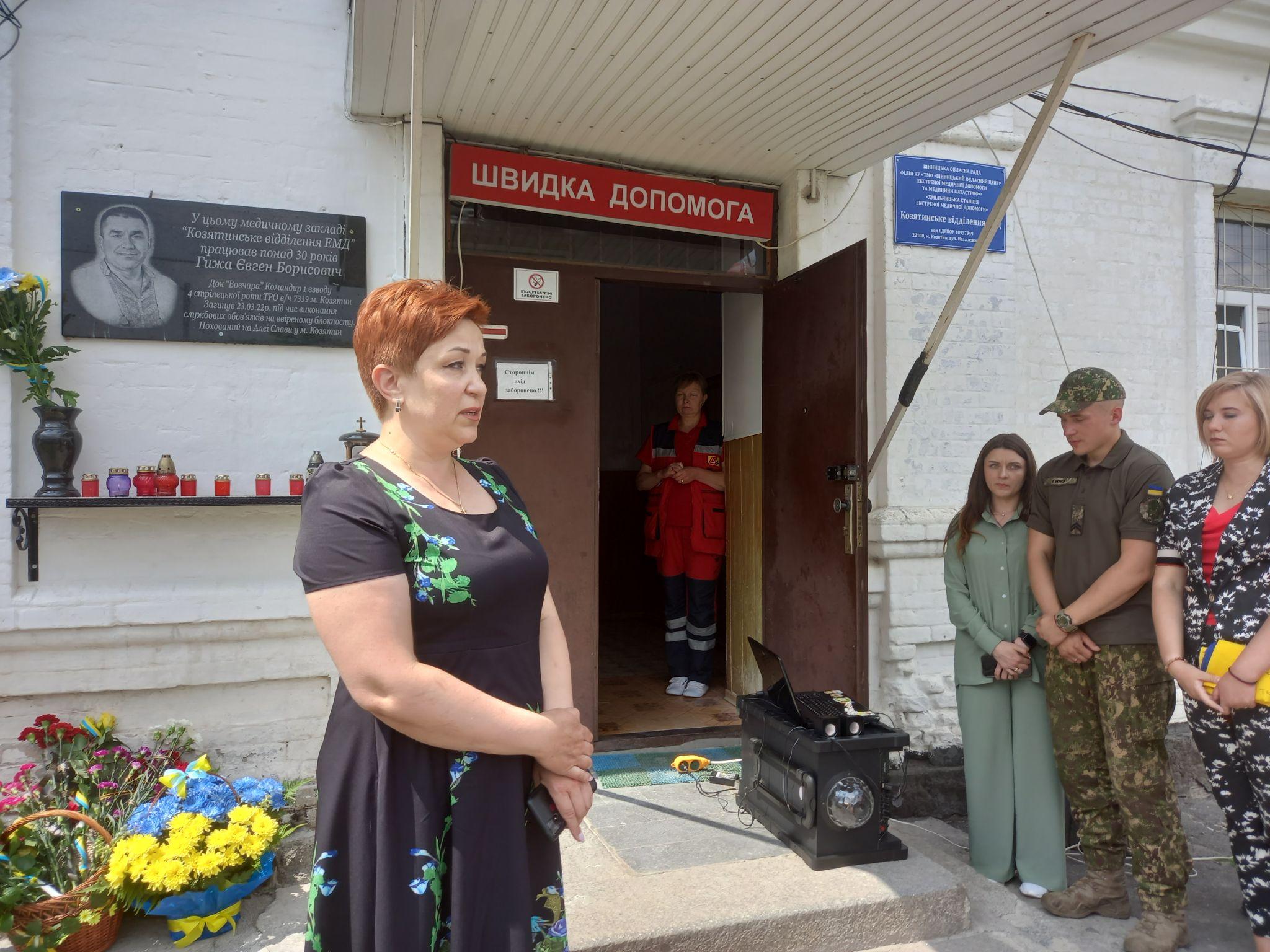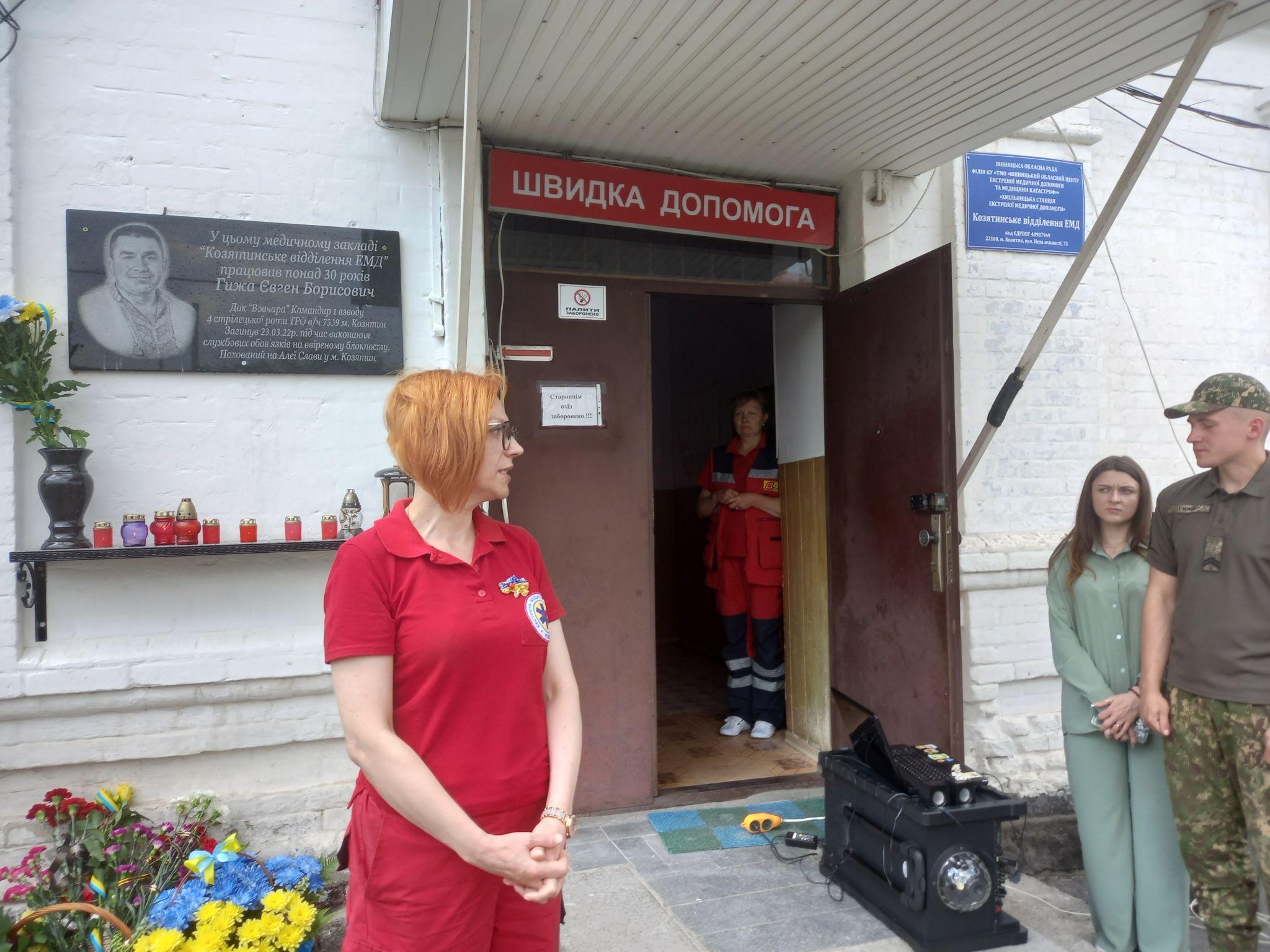— Про втрати завжди говорити боляче, а коли із життя йдуть дуже близькі та дорогі тобі люди, говорити боляче вдвічі, — каже Олена Мисюра, ведуча заходу. — Сьогодні на фасаді медичного закладу Козятинське відділення екстреної медичної допомоги з’явиться дошка нашому земляку, командиру першого взводу четвертої стрілецької роти ТРО військової частини 7339 міста Козятин Євгенію Гижі. Людина з великої літери, Герой, козятинський захисник та медик високого рівня. Людина слова, який так любив життя та людей навколо.