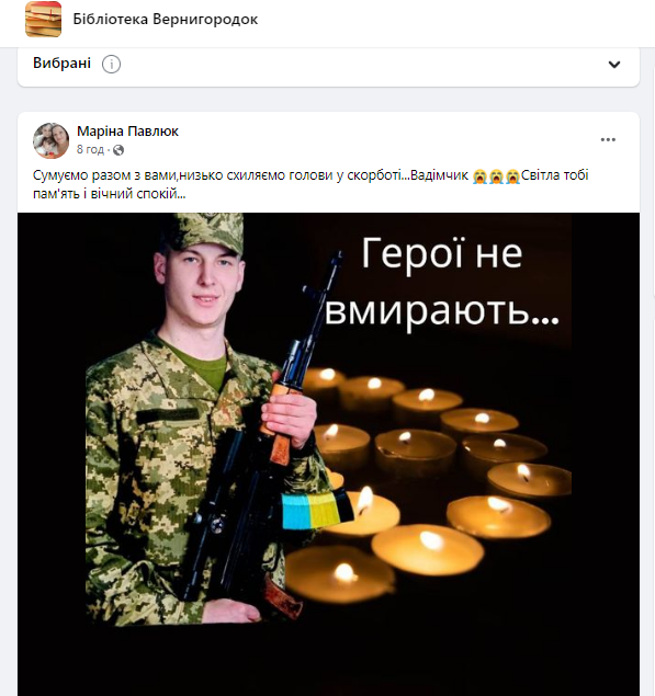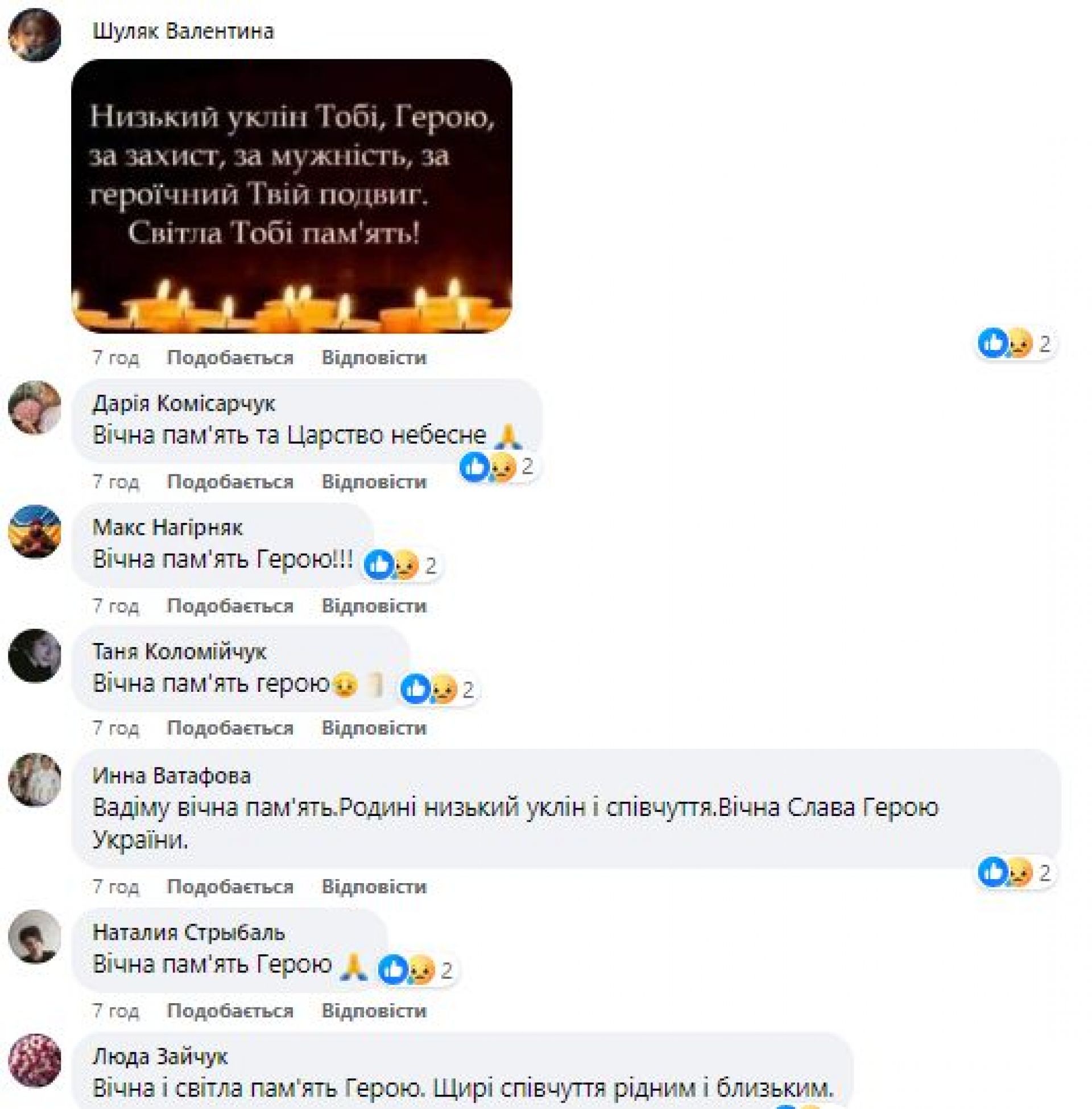 — Сумуємо разом з вами, низько схиляємо голови у скорботі...Вадімчик. Світла тобі пам'ять і вічний спокій... — пише Маріна Павлюк в групі Бібліотека Вернигородок.