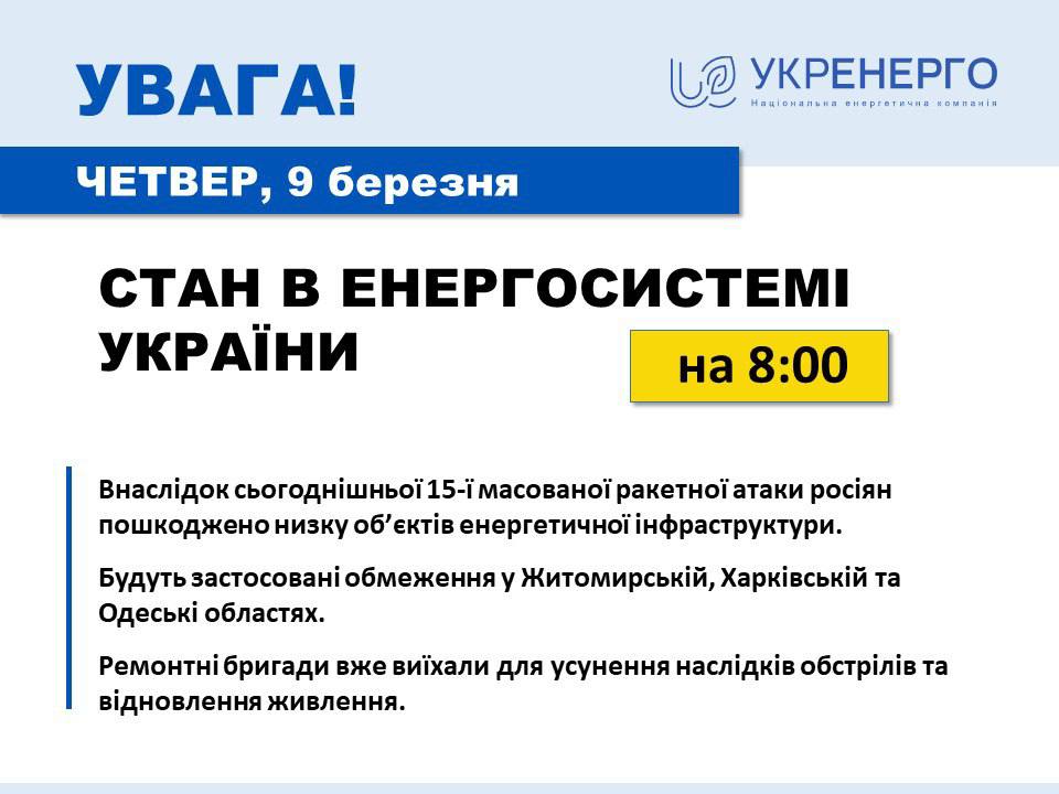 Тому обмеження будуть застосовані у Житомирській, Харківській та Одеські областях. Ремонтні бригади вже виїхали для усунення наслідків обстрілів та відновлення живлення, — повідомили в Укренерго