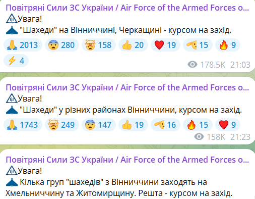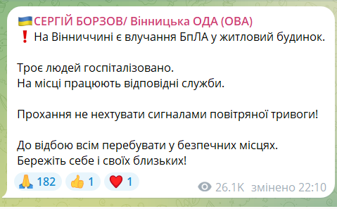 Згодом, о 22.10 офіційно, голова Вінницької ОВА Сергій Борзов повідомляє — на Вінниччині є влучання БпЛА у житловий будинок.