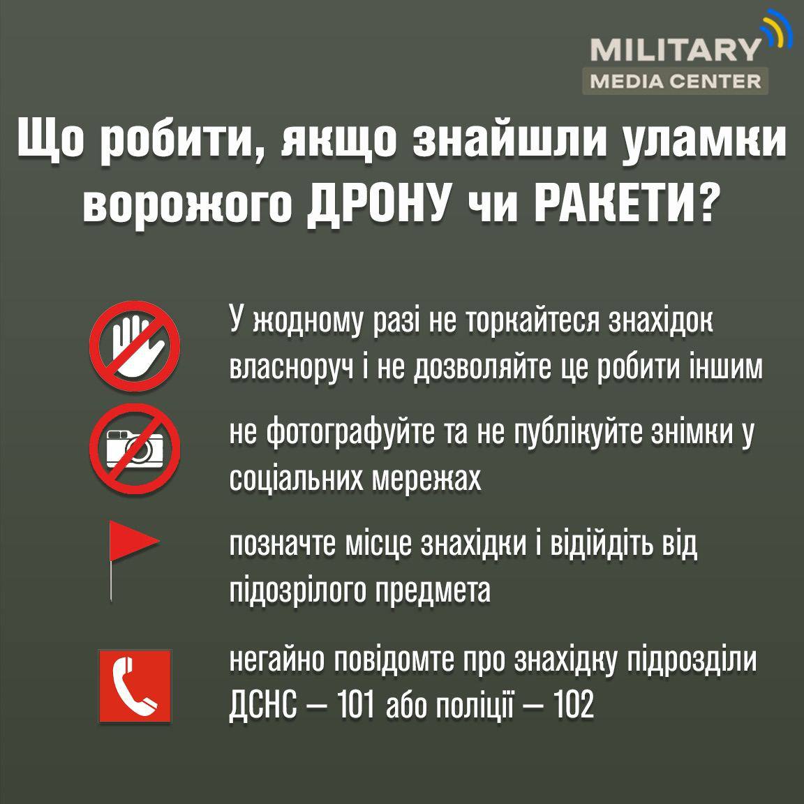 — Увага! При виявленні підозрілих предметів, схожих на безпілотники, застерігаємо громадян не здійснювати жодних дій самостійно, а одразу сповіщати правоохоронців чи місцеву військову адміністрацію, — застерагіють у Повітряних Силах.