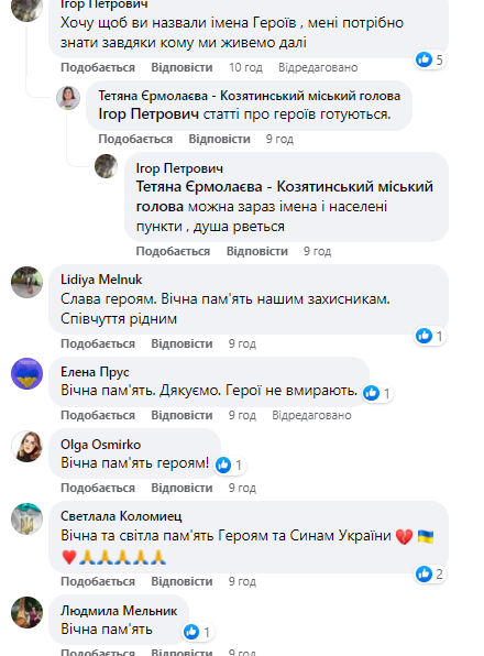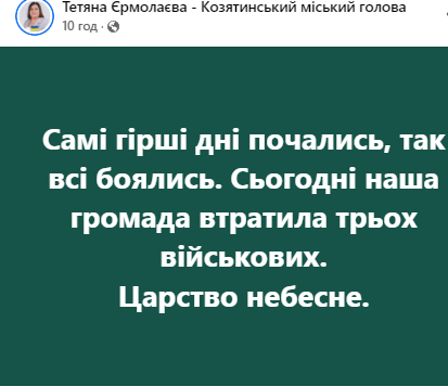 - «Самі гірші дні почались, так всі боялись. Сьогодні наша громада втратила трьох військових. Царство небесне» — написала на своїй сторінці вчора, 7 березня міський голова Козятина Тетяна Єрмолаєва