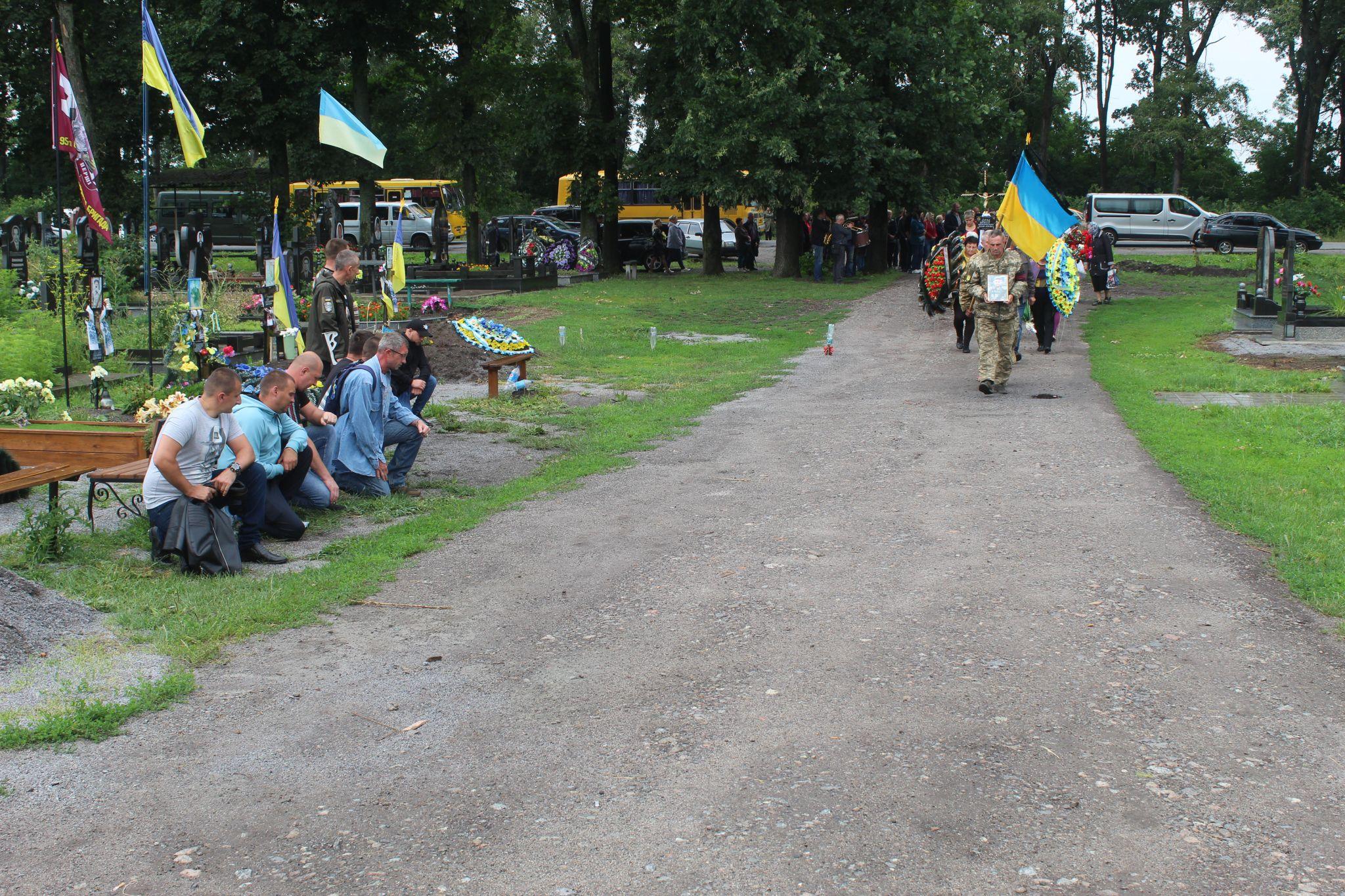 На алею Слави принесли Олексія, вразило те, що деякі хлопці, які хвилину тому йшли, спираючись на милиці, стали перед процесією на коліна. Така шана живих воїнів передової до тих, хто віддав за наш спокій своє життя