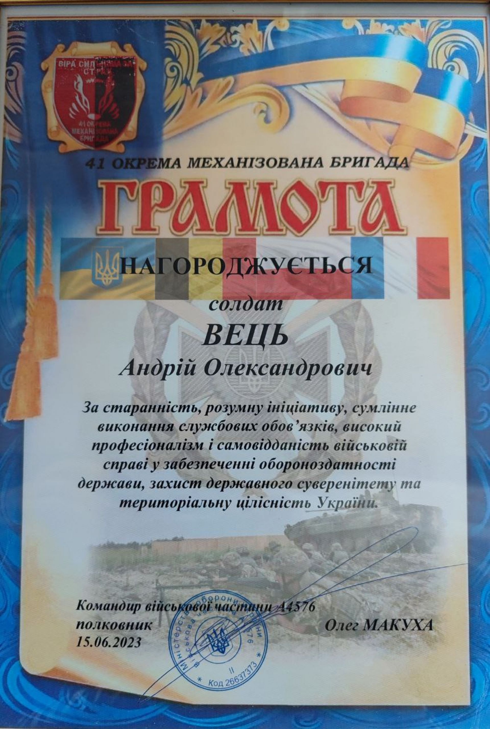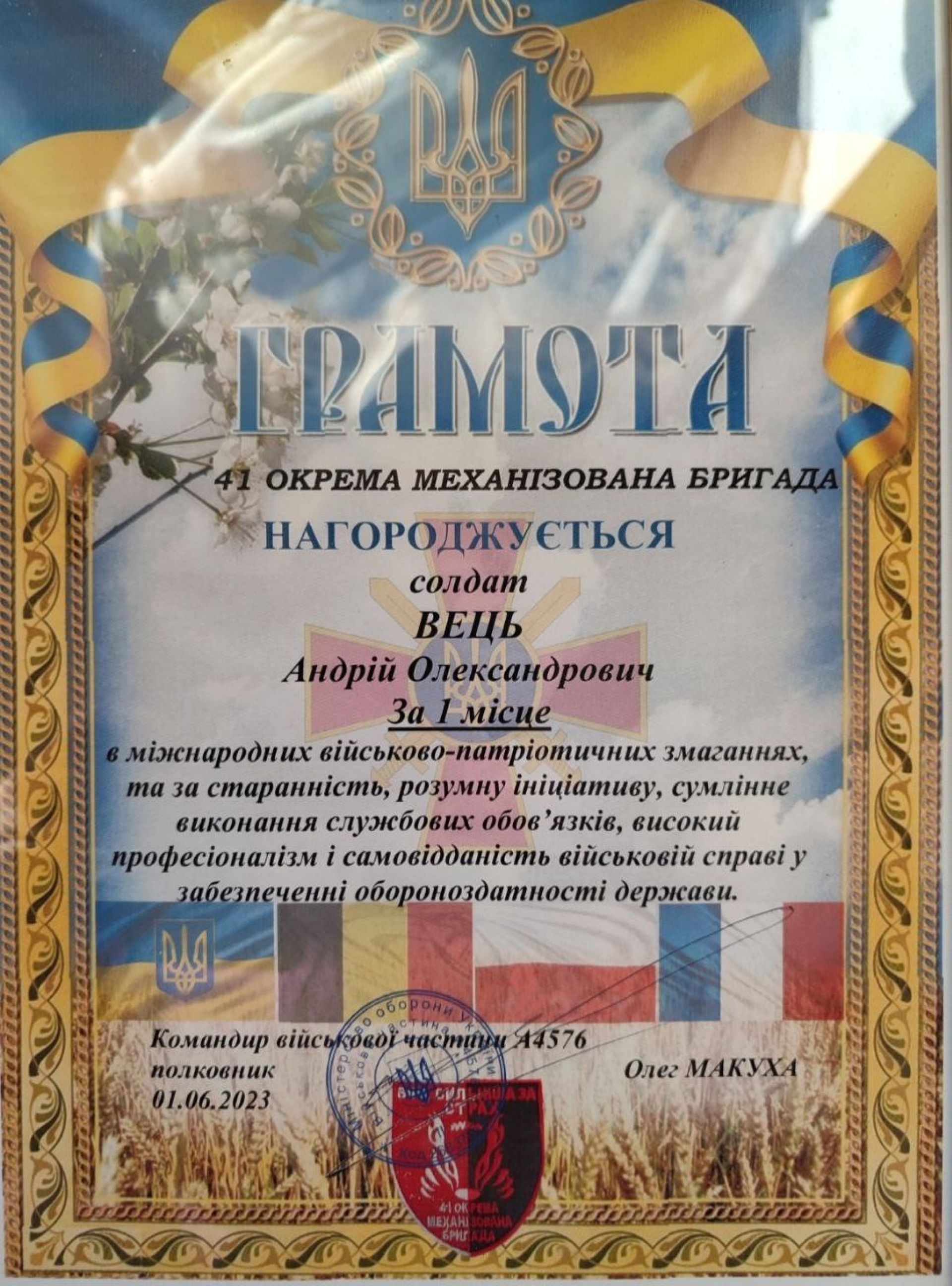 Андрій Вець потрапив до 41 Окремої механізованої бригади. Спершу протягом місяця проходив вишкіл у Кіровоградській області, а потім — у Польщі. Там брав участь у військово-патріотичних змаганнях, отримав грамоту і за участь у змаганнях, і від командира частини.