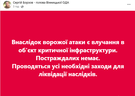 — За уточненою інформацією Повітряних Сил України, на території Вінницької області протиповітряна оборона працювала по 4 ворожих шахедах. Усі збили. Внаслідок протиповітряного бою уламки «Шахеда» пошкодили об'єкт критичної інфраструктури. Постраждалих немає. Наразі ведуться відповідні роботи щодо ліквідації наслідків, — пише Сергій Борзов