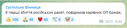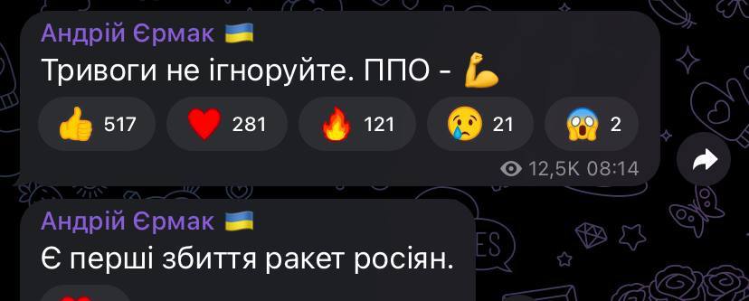 Станом на 8.30 є перші збиття російських ракет. Про це повідомив керівник ОП Єрмак.