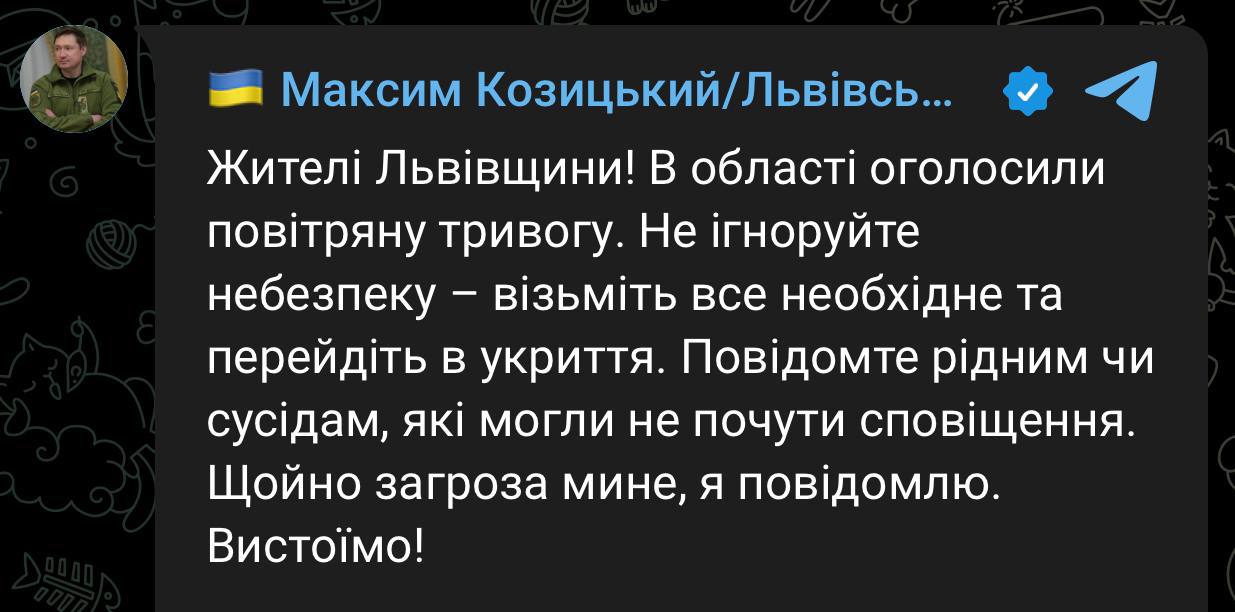 Голова Львівської ОВА також закликав не ігнорувати повітряною тривогою!