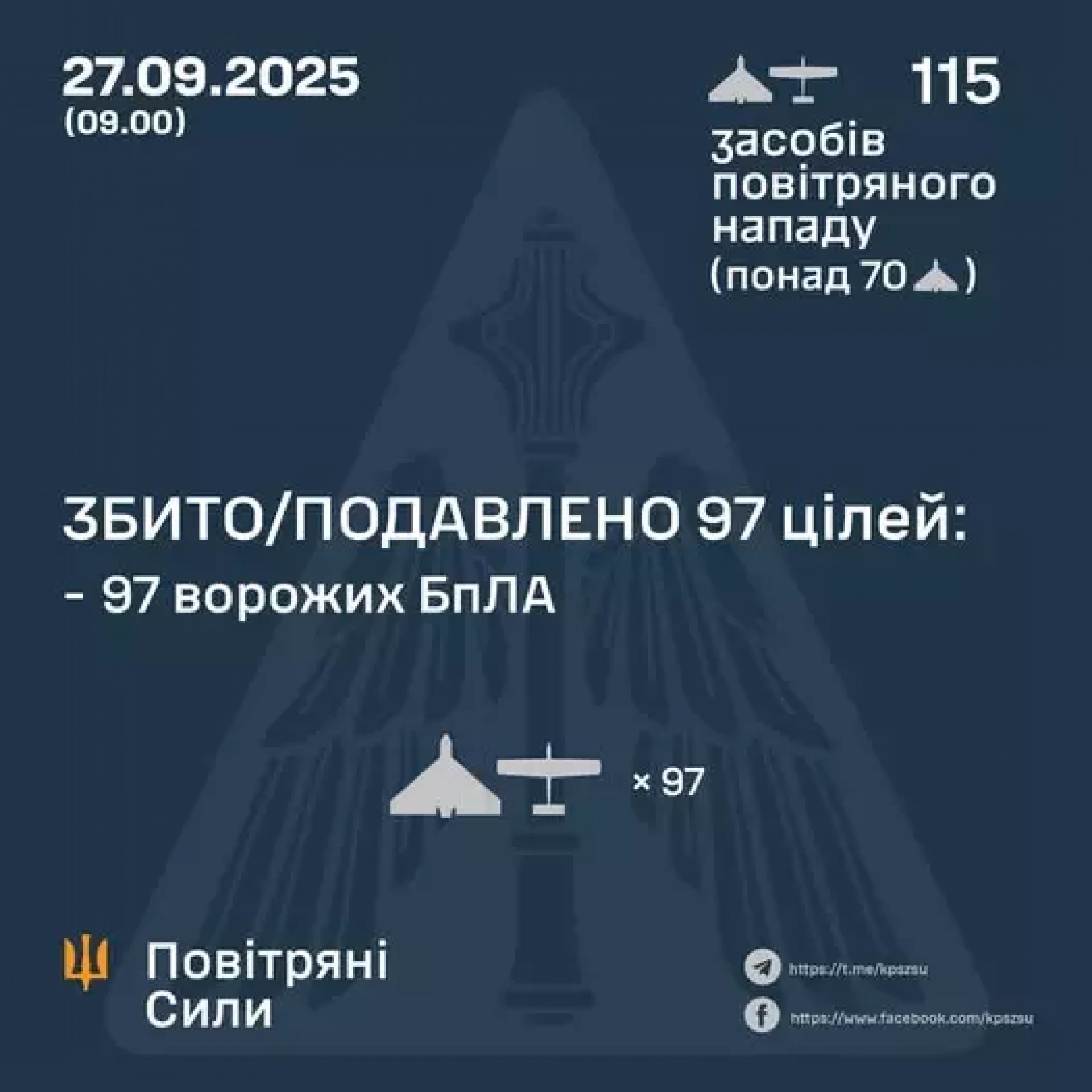 Протиповітряна оборона (авіація, зенітні ракетні війська, підрозділи РЕБ та мобільні вогневі групи) збила/подавила 97 ворожих БпЛА у північних, південних, східних та центральних областях країни.