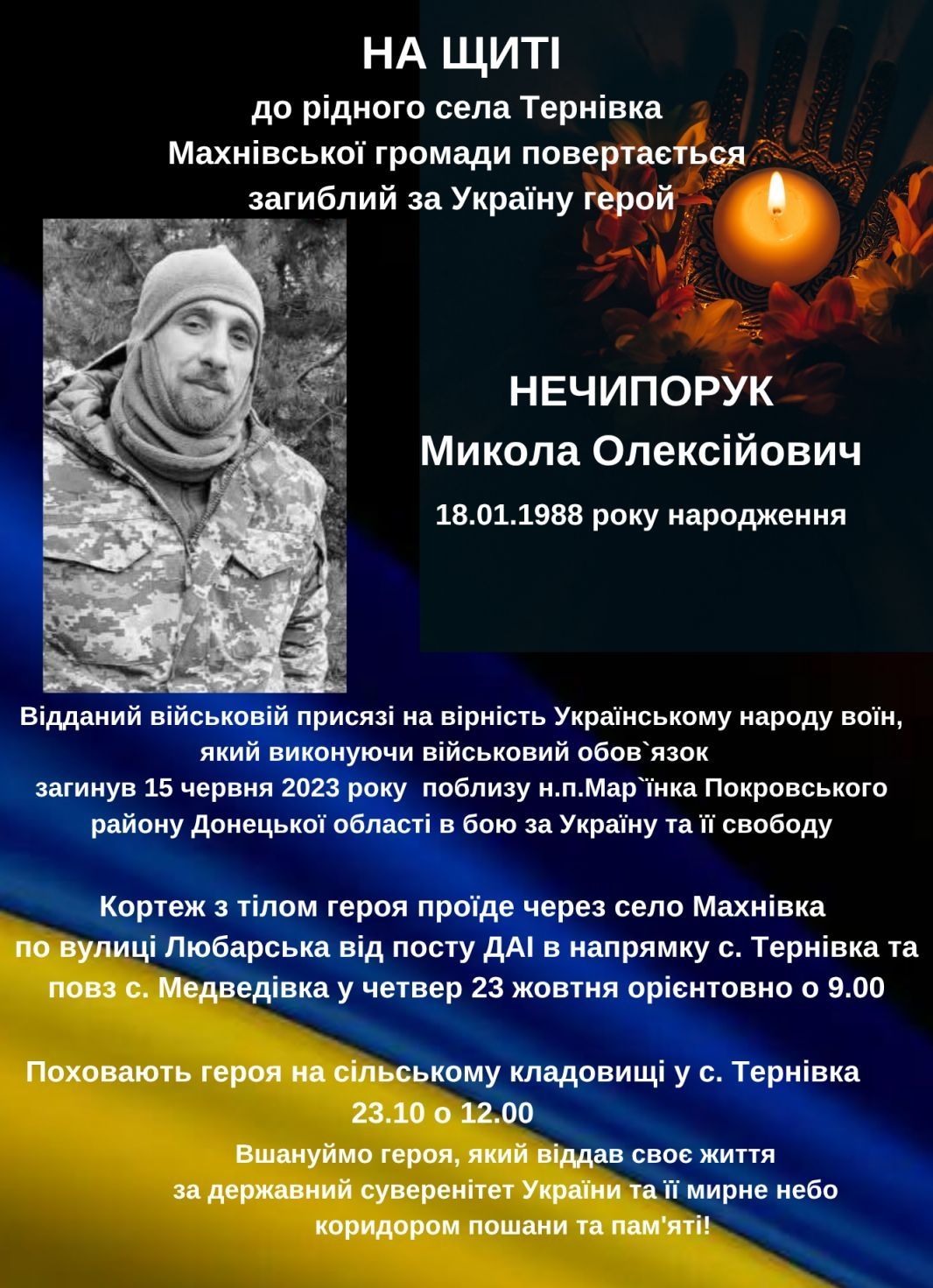 - Завтра, 23 жовтня востаннє до рідної домівки у селі Тернівка на щиті повертається Захисник України — Микола Нечипорук