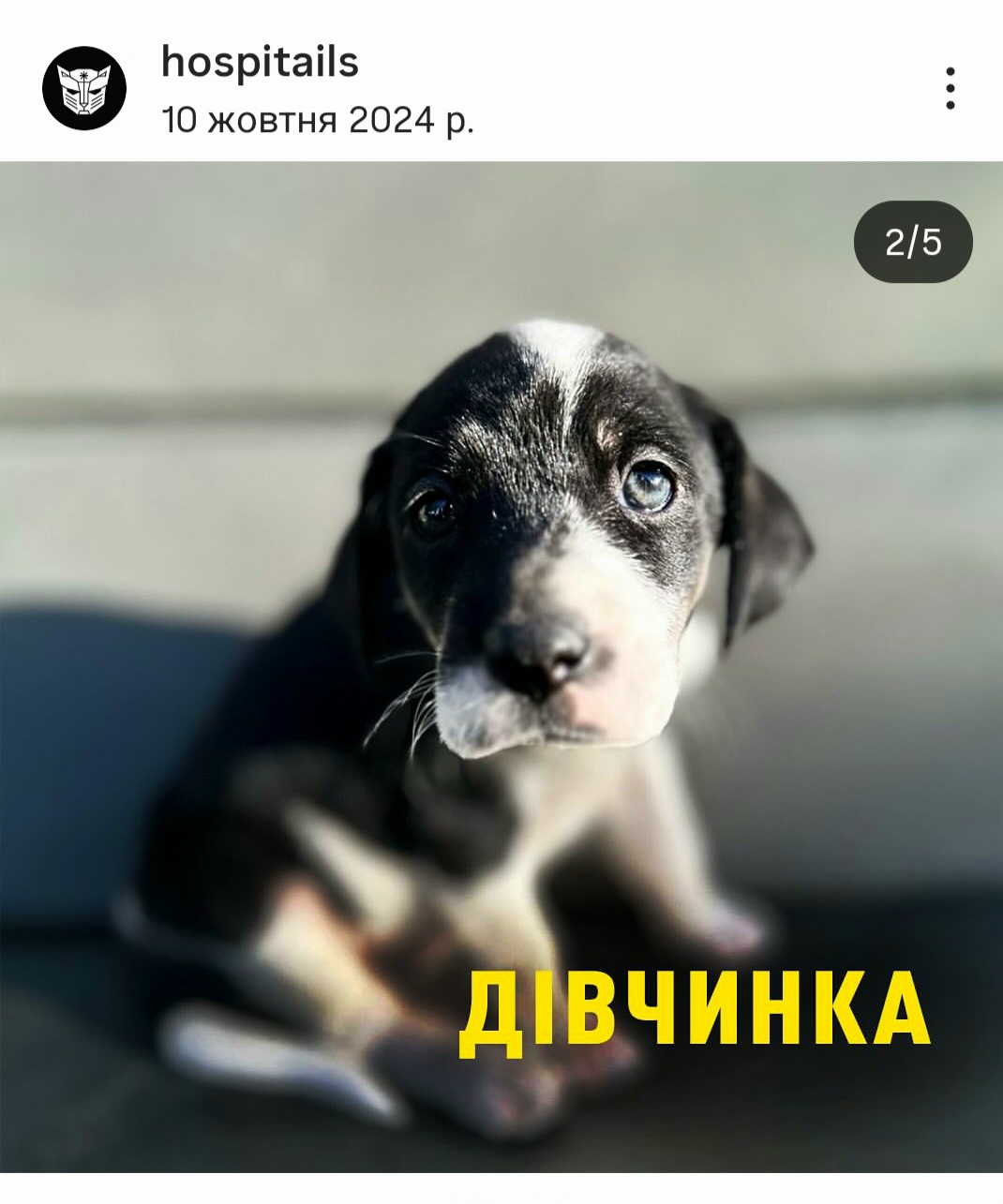 — Моя донька Уляна підписана на медичний добровольчий батальйон «Госпітальєри» в інстаграм, — розповідає Наталія Радько, опікунка Терри. — Госпітальєри займаються евакуацією поранених і є ще одна група — «Госпітейлз», яка допомагає тваринам у зоні бойових дій та на прифронтових територіях. У групі «Госпітейлз» опублікували оголошення, що п’ять цуценят із фронту шукають дім. Серед них була дівчинка з чорно-білою мордочкою. Тоді їй був місяць.