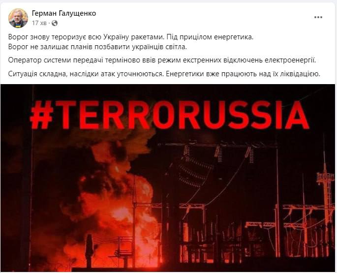 — Ворог знову тероризує всю Україну ракетами. Під прицілом енергетика. Ворог не залишає планів позбавити українців світла— , - міністр зазначив, що триває ліквідація всіх наслідків ударів.