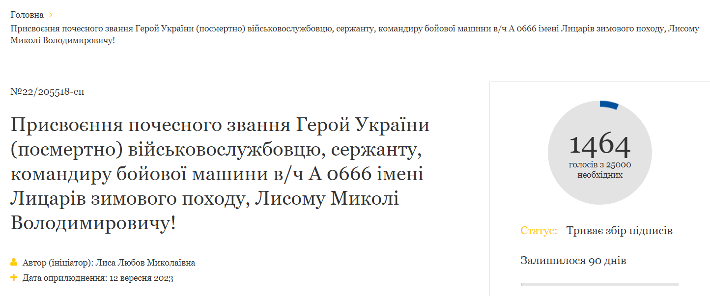 — Шановний Президенте. Звертаюся до Вас, як мама загиблого сина, Лисого Миколи Володимировича. Прошу Вас розглянути петицію про присвоєння почесного звання Герой України (посмертно) військовослужбовцю Збройних Сил України Лисого Миколи Володимировича. Я пишаюся своїм сином, його незламністю та патріотизмом і вважаю, Микола Лисий — справжній Герой, який заслуговує на найвищу державну нагороду — Герой України (посмертно). із врученням ордена «Золота Зірка» його мамі. Вічна пам’ять і шана всім, хто віддав своє життя за Україну!