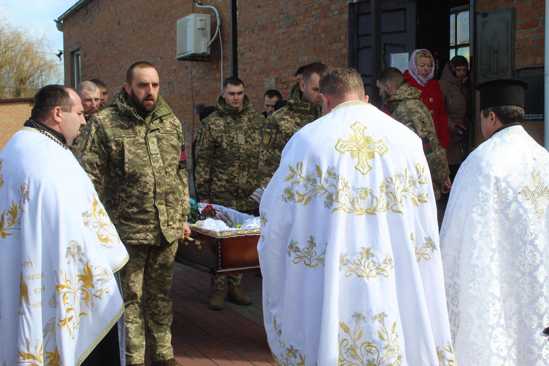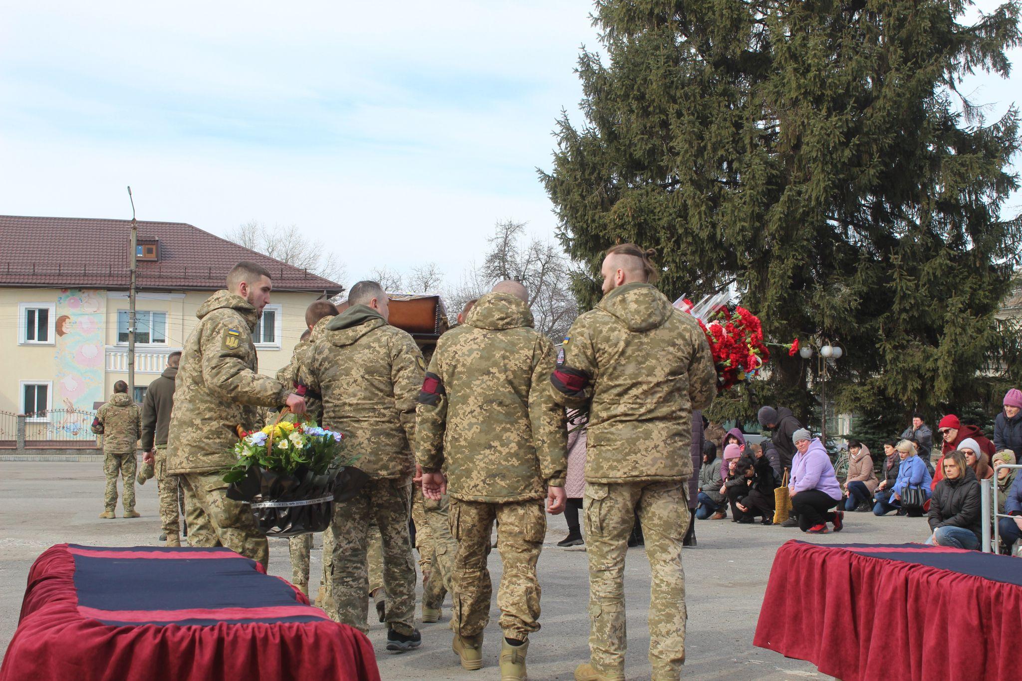 Після виступу міського голови з Віталієм стали прощатися громада. Спочатку рідні, близькі, потім друзі, сусіди знайомі воїна. Перечекавши всіх віддали шану Віталію його побратими.