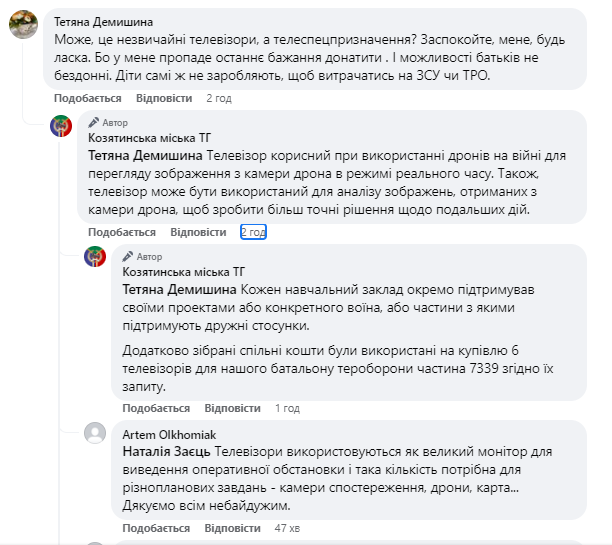 — Ці телевізори є незамінними помічниками нашим захисникам у виконанні їхніх важливих завдань. Вони дозволяють отримувати оперативну інформацію, спостерігати за рухом ворожих сил і координувати свої дії. Кожен день наші воїни ризикують своїм життям, щоб ми могли жити в мирі та безпеці. Тому кожна допомога, яку ми можемо надати, є надзвичайно важливою. Бажаємо нашим воїнам перемоги та повернення додому живими та здоровими, радом до перемоги! — написала Тетяна Єрмолаєва - Козятинський міський голова·