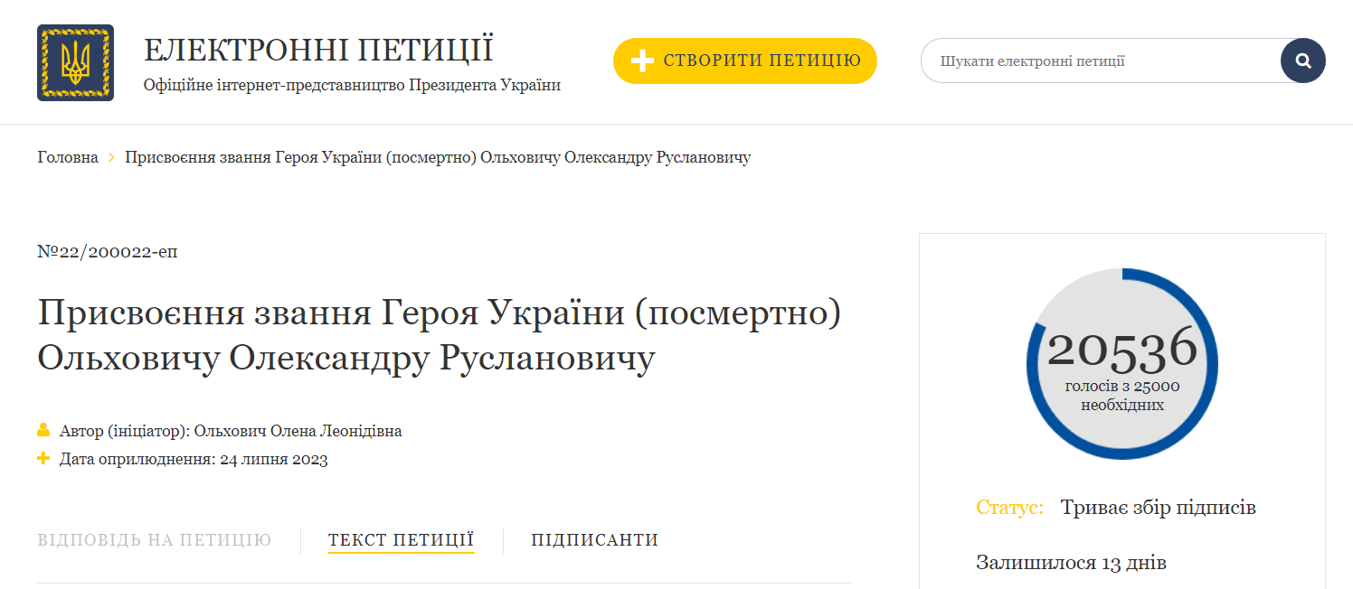 Залишилось менше 5 тисяч голосів. Просять присвоїти звання «Героя України» Олександру Ольховичу