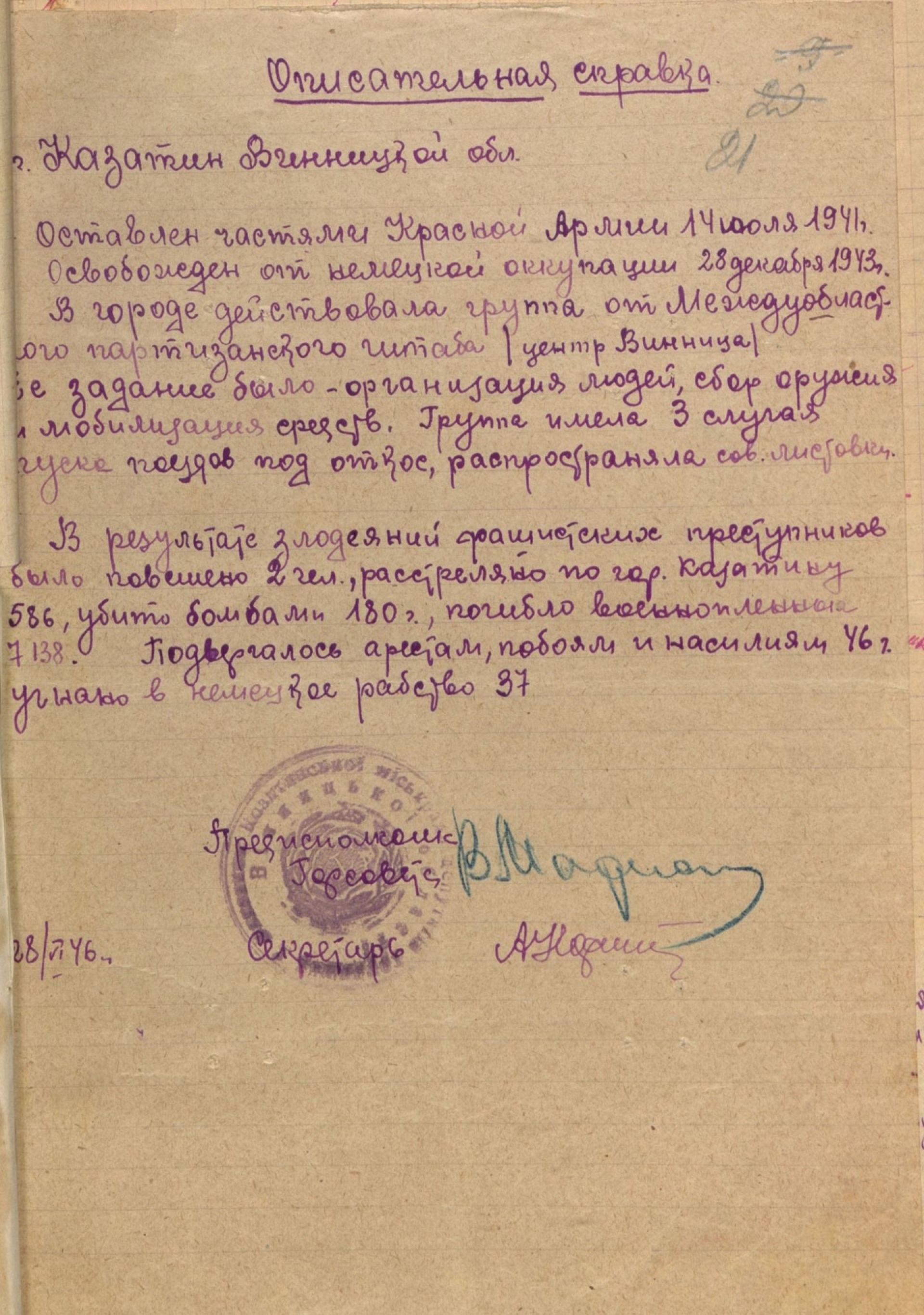 В дописі йдеться — наприкінці 1943 р. фашисти зосередили в Козятині великі військові сили. Крім залізничного вузла, тут знаходились склади військового майна і зброї. Підступи до міста були надійно блоковані. Та війська 1-го Українського фронту, зокрема 1-ої танкової армії , розвиваючи наступ, наблизилися до міста і 28 грудня 1943 р. оволоділи ним.