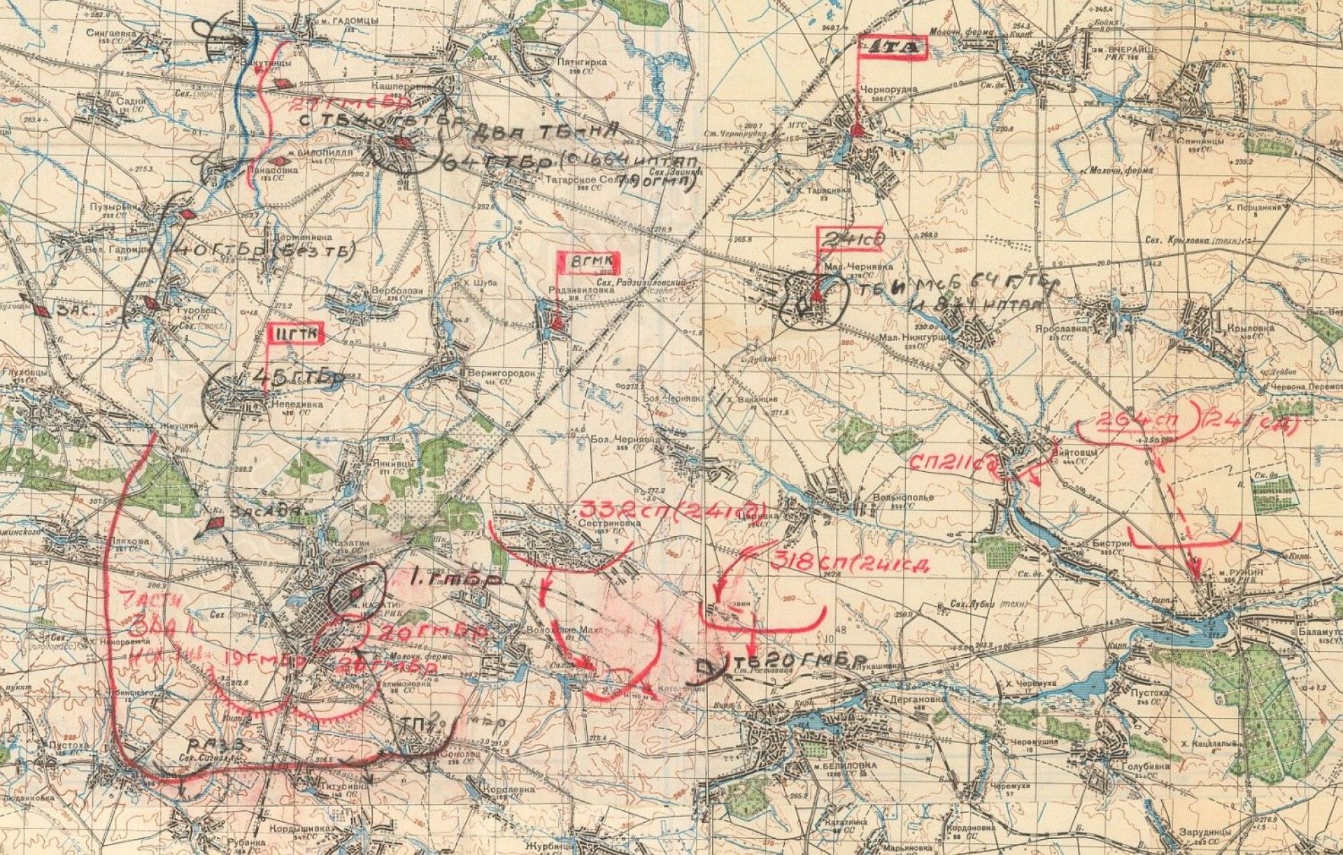 2. 13.00 29.12.43 г. 6 танков и до 150 человек пехоты противника прорвались и контратаковали наши части в направлении сахарозавода. В 14.00 10 танков и до батальона пехоты контратаковали наши части с юга в направлении сахарозавода. ТБ с ротой автоматчиков МБА и частями полковника Бабаджаняна (20-я гвардейская механизированная бригада) ведет бой с прорвавшимся противником в вышеуказанных районах.