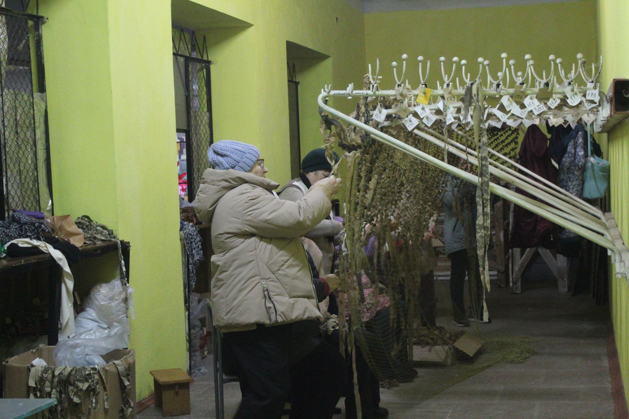 У час нашого візиту, у волонтерок не було світла через графік вимкнення освітлення, а жінки й не думали припиняти роботу. Одні на рибальській сітці зав’язували на вузлики стрічки, а їх колеги по цеху світили на сітку ліхтариками з мобільних телефонів.