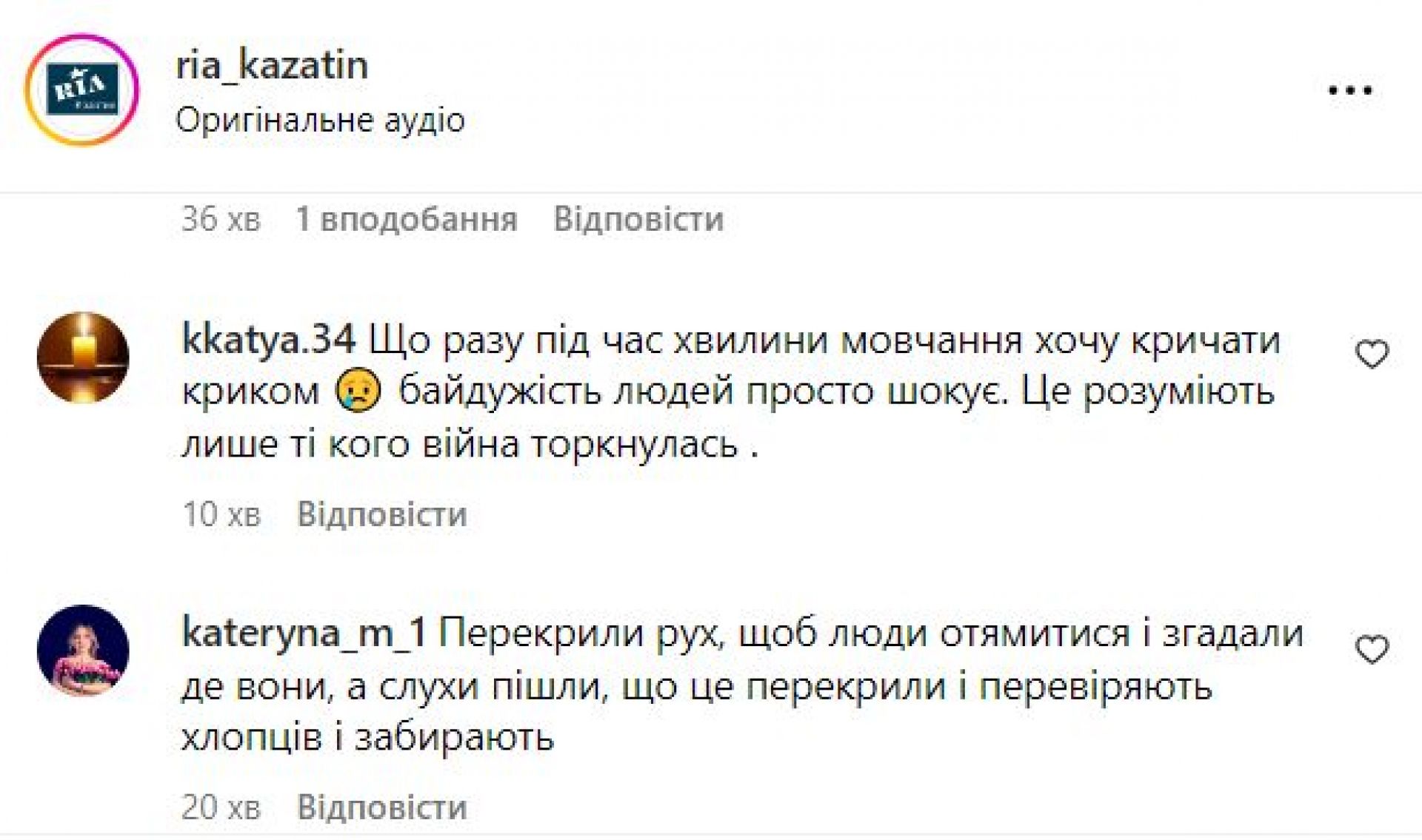 Таку акцію у Козятині провели вперше за майже два роки війни і реакції козятинчан були різні. Деякі перехожі зупинялись і завмирали під звуки метронома. Деякі продовжували йти по своїх справах і навіть не звертали уваги на те, що відбувається. Були й такі, серед водіїв, що незважаючи на те, що на перехресті стояла автівка поліцейських, а біля неї самі ж правоохоронці та працівники ТЦК, все ж намагались проїхати далі…