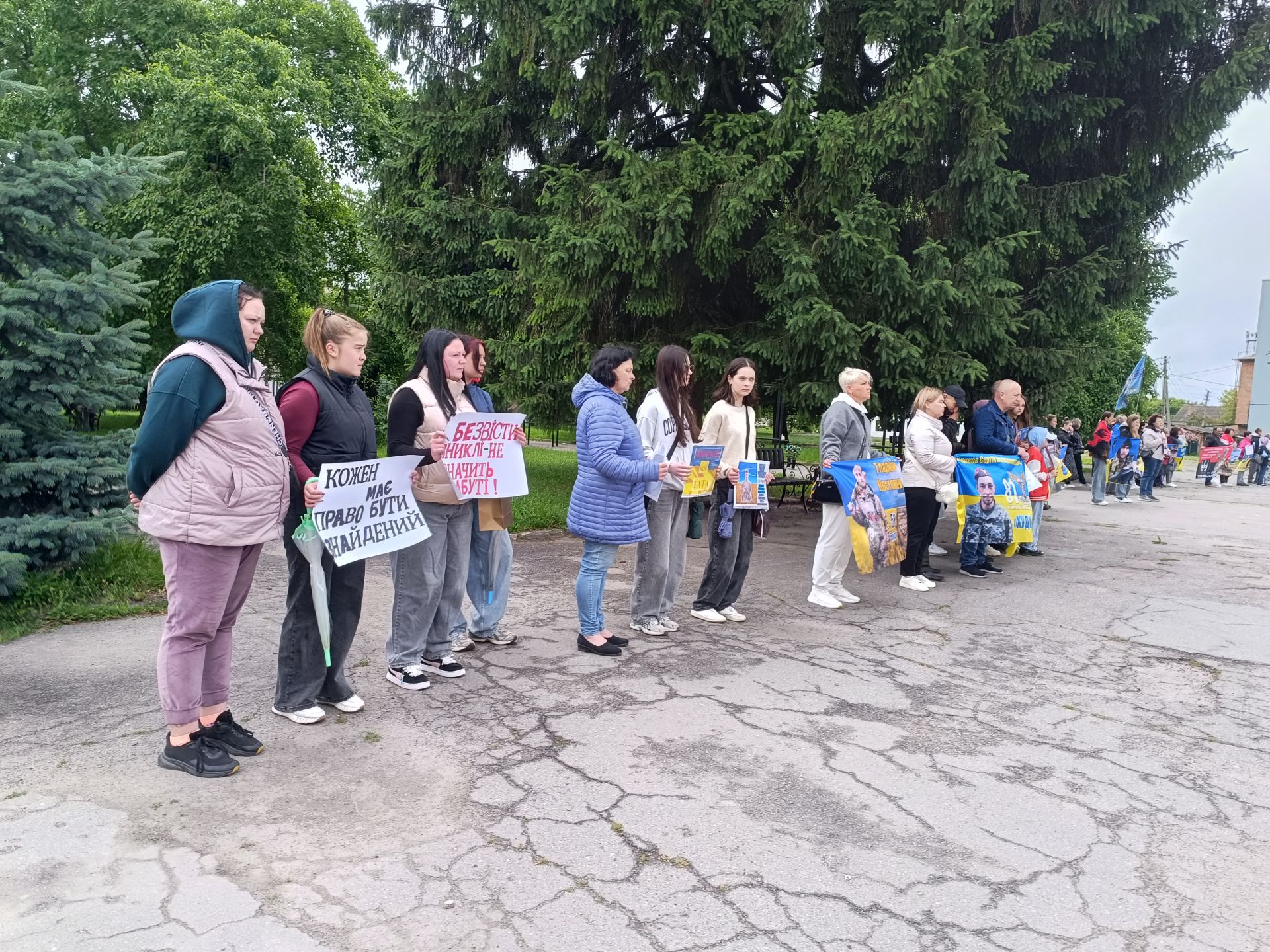 Після хвилини мовчання ведуча мітингу Лариса Ромасько зачитала імена військових із Козятинської громади, які зникли безвісти. Серед імен, які прозвучали — Богдан Гилун. Він зник півтора роки тому на Покровському напрямку. Вдома його чекає дружина та синочок, якому два з половиною роки.