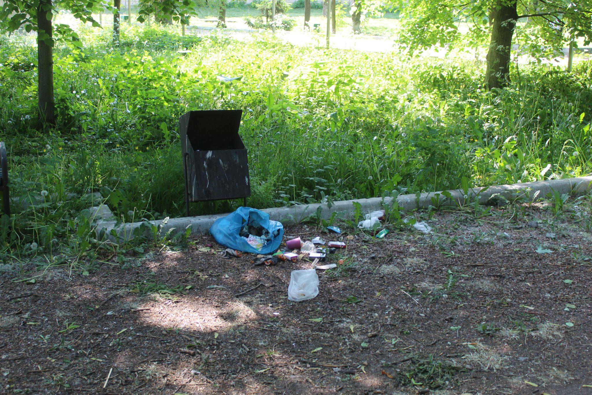 У парку залізничників ми зробили декілька фото. Перше, що кинулось в очі — повні сміття баки. Працівники вокзалу кажуть, що кожного дня сміття в парку забирається.