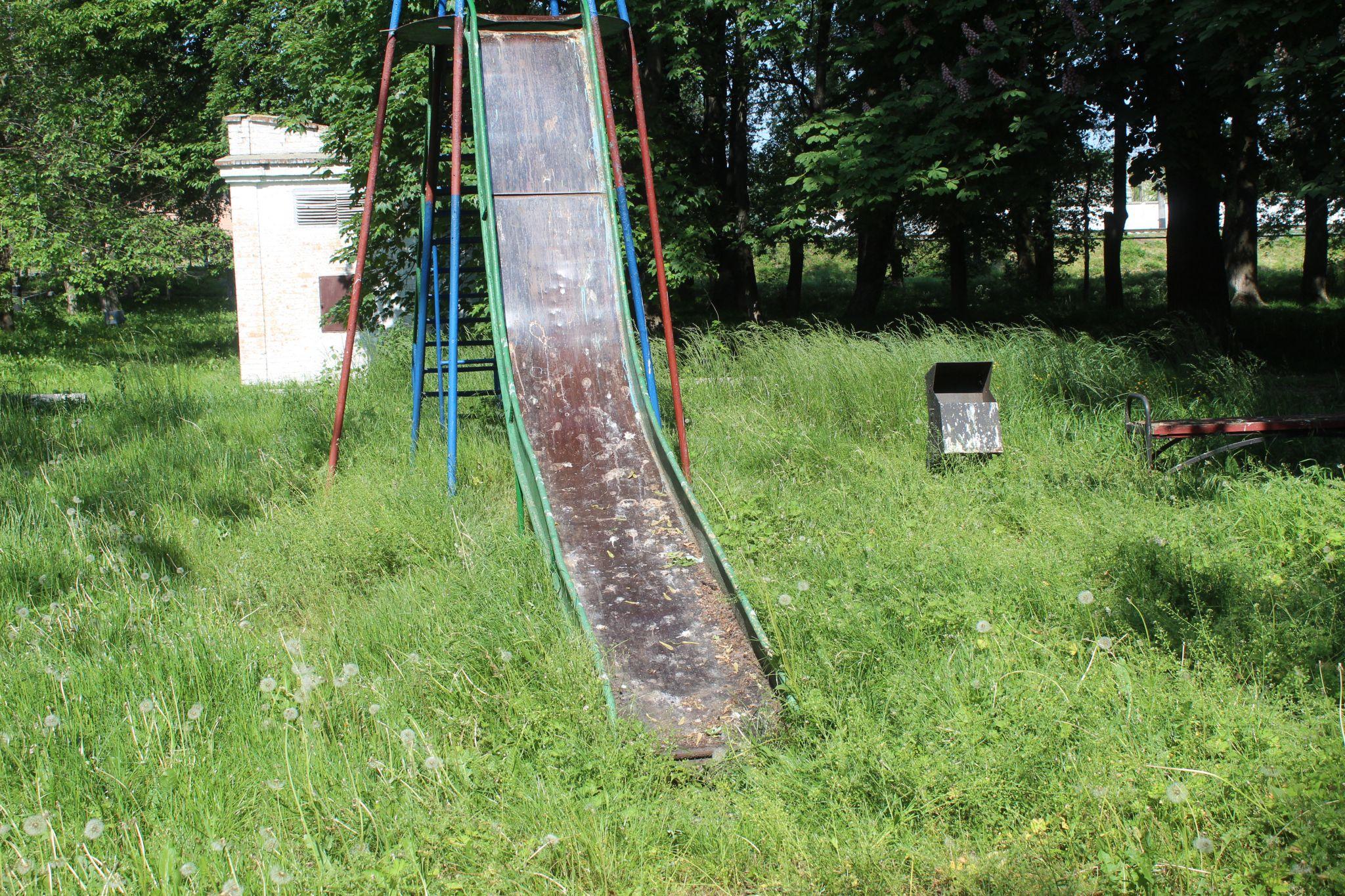 У жалюгідному стані дитячий майданчик. Якщо на гойдалках ще гойдаються діти, то до гірки ніхто навіть не підходить. Воно й не дивно, яка мама дозволить витирати штанами гірку, вкриту пташиним послідом?
