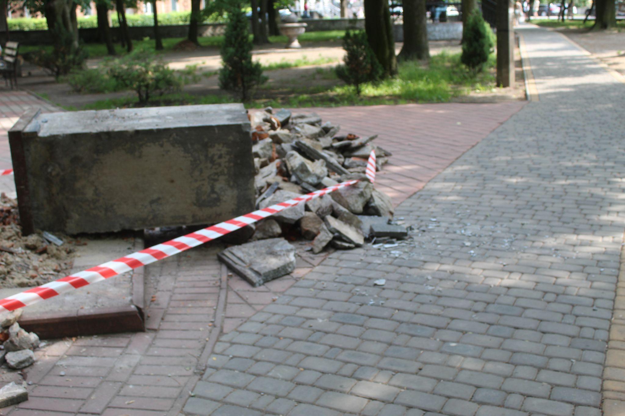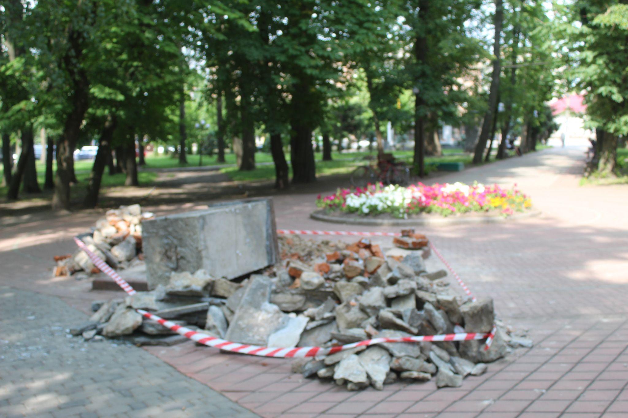 Купи цегли вперемішку з побитими мармуровими плитами робітники огородили червоно-білою стрічкою та й пішли займатися іншими справами.