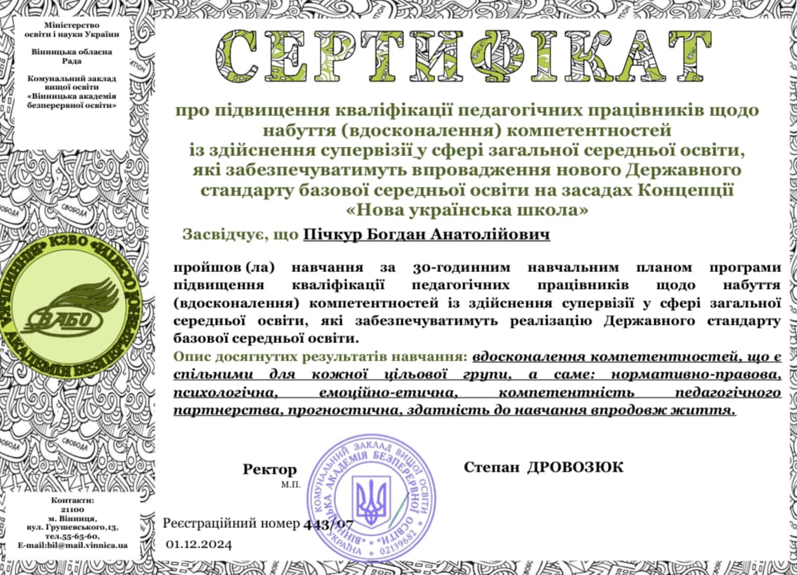 - Днями вчитель з Козятина Богдан Пічкур отримав Сертифікат про підвищення кваліфікації педагогічних працівників щодо набуття (вдосконалення) компетентностей із здійснення супервізії у сфері загальної середньої освіти, які забезпечуватимуть впровадження нового державного стандарту базової середньої освіти на засадах Концепції «Нова українська школа»