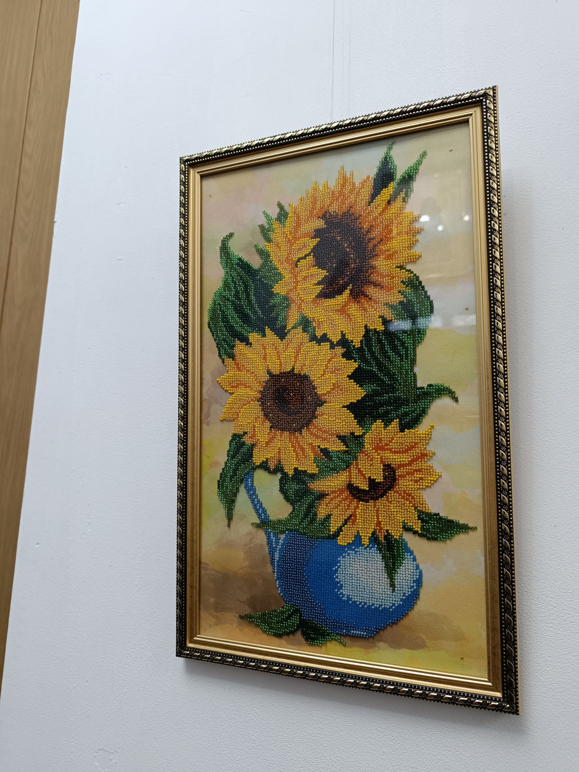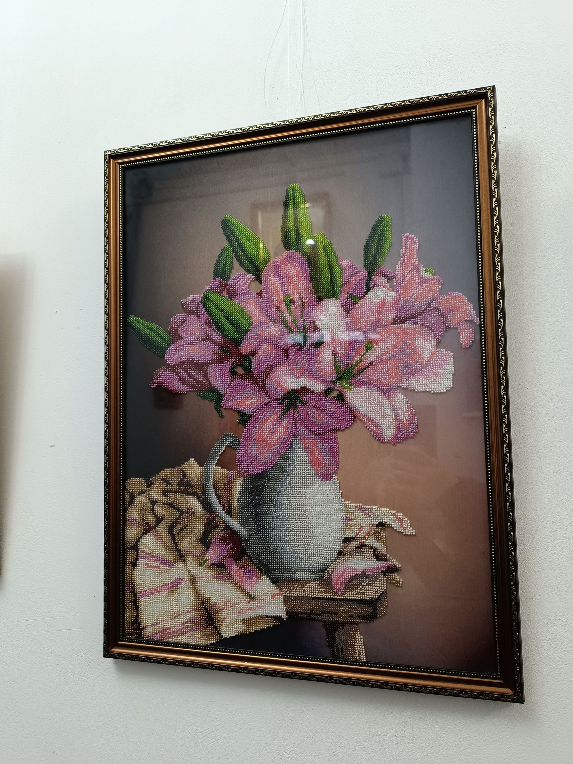 — Зараз дуже модно медитувати, — продовжує Наталія. — Для мене бісер — це медитація. Я починала з маленьких картинок. Спершу вишила маленький Герб, мені дуже сподобалося. Потім спробувала вишити ромашки, вони теж були невеликого формату. Потім вже перейшла на більші картини. Спочатку робила неповну зашивку, потім вже почала повну. І так у мене зібралася вже колекція. Щоправда, багато моїх картин без рамок, оскільки оформляти роботи — це не дешево. Найважча моя робота — вовки. Вони складні, тому що чорно-білі. Навіть бувало таке, коли сиділа довго за вишивкою, то в очах все біле ставало. Але коли я їх вставила в рамку і побачила результат — це вартувало того часу і сил, що я на них витратила.