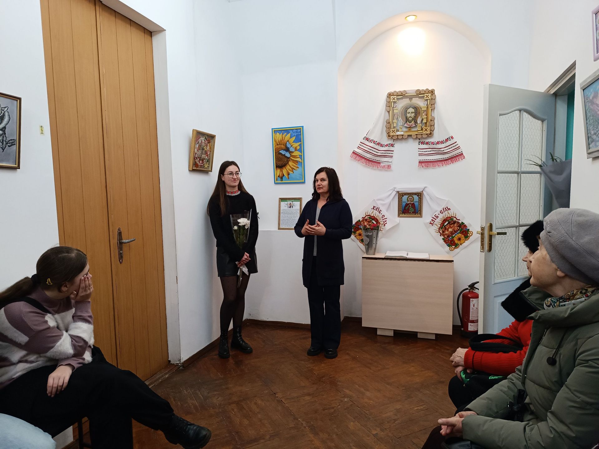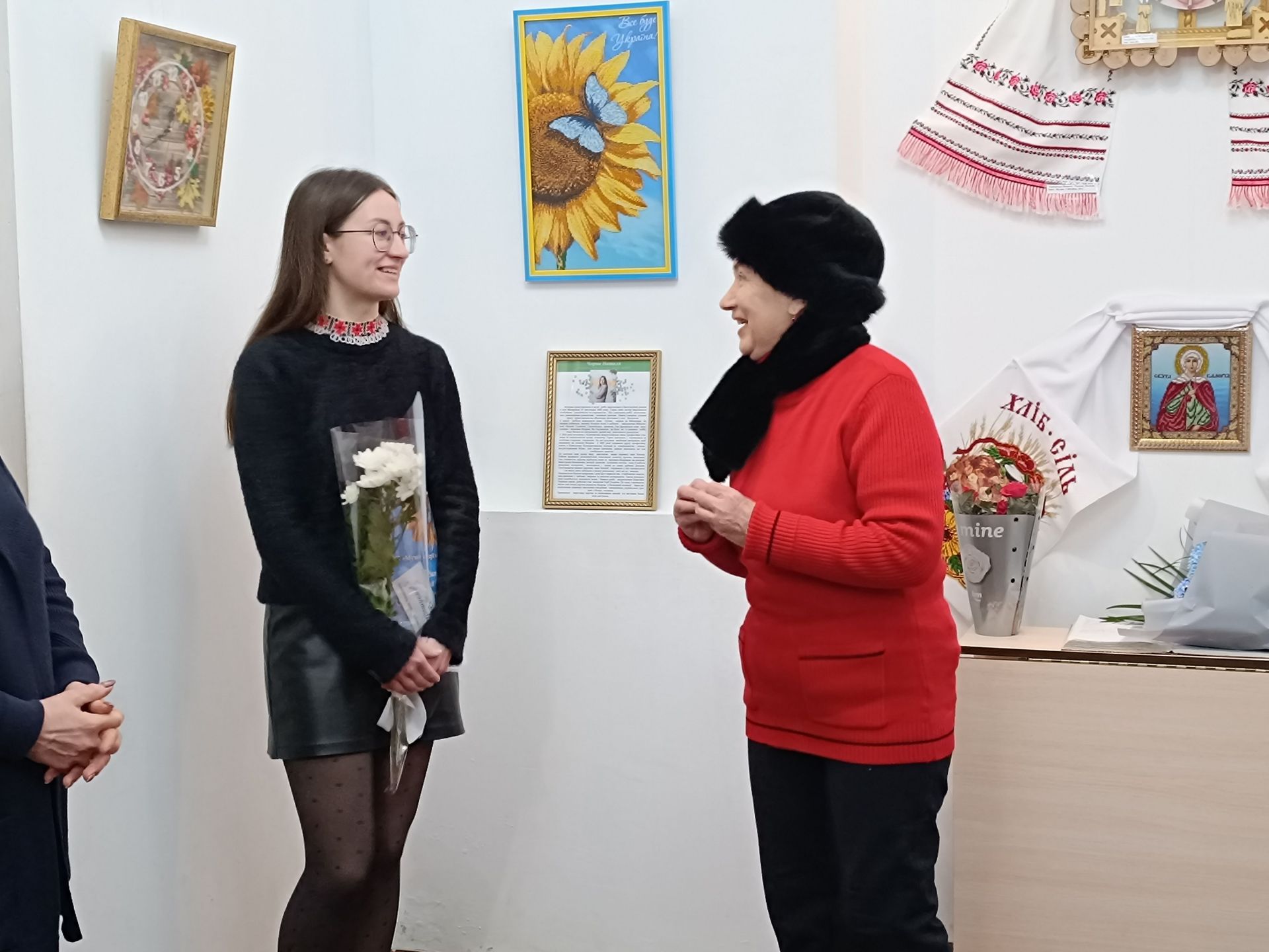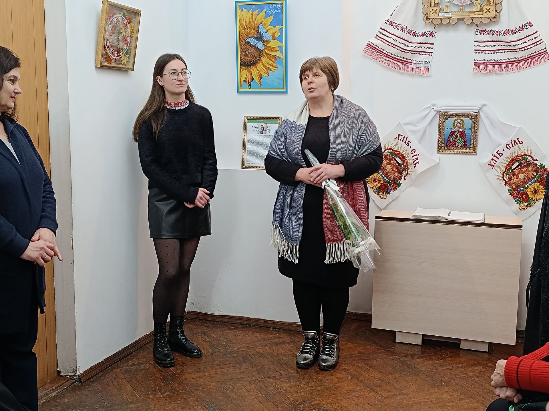 Привітати із відкриттям виставки і підтримати майстриню завітали учні ліцею №3, знайомі, близькі та творчі люди. Своїми побажаннями і враженнями поділилися бібліотекар Оксана Сьоміна, фахівець соціальної роботи, рукодільниця Олена Слободянюк, майстриня Галина Сушко, начальник відділу культури Світлана Рибінська. Учениця музичної школи Кіра Вахлярська подарувала усім гостям виставки пісню «Синє небо, жовте поле» (викладач Богдана Семикоз).