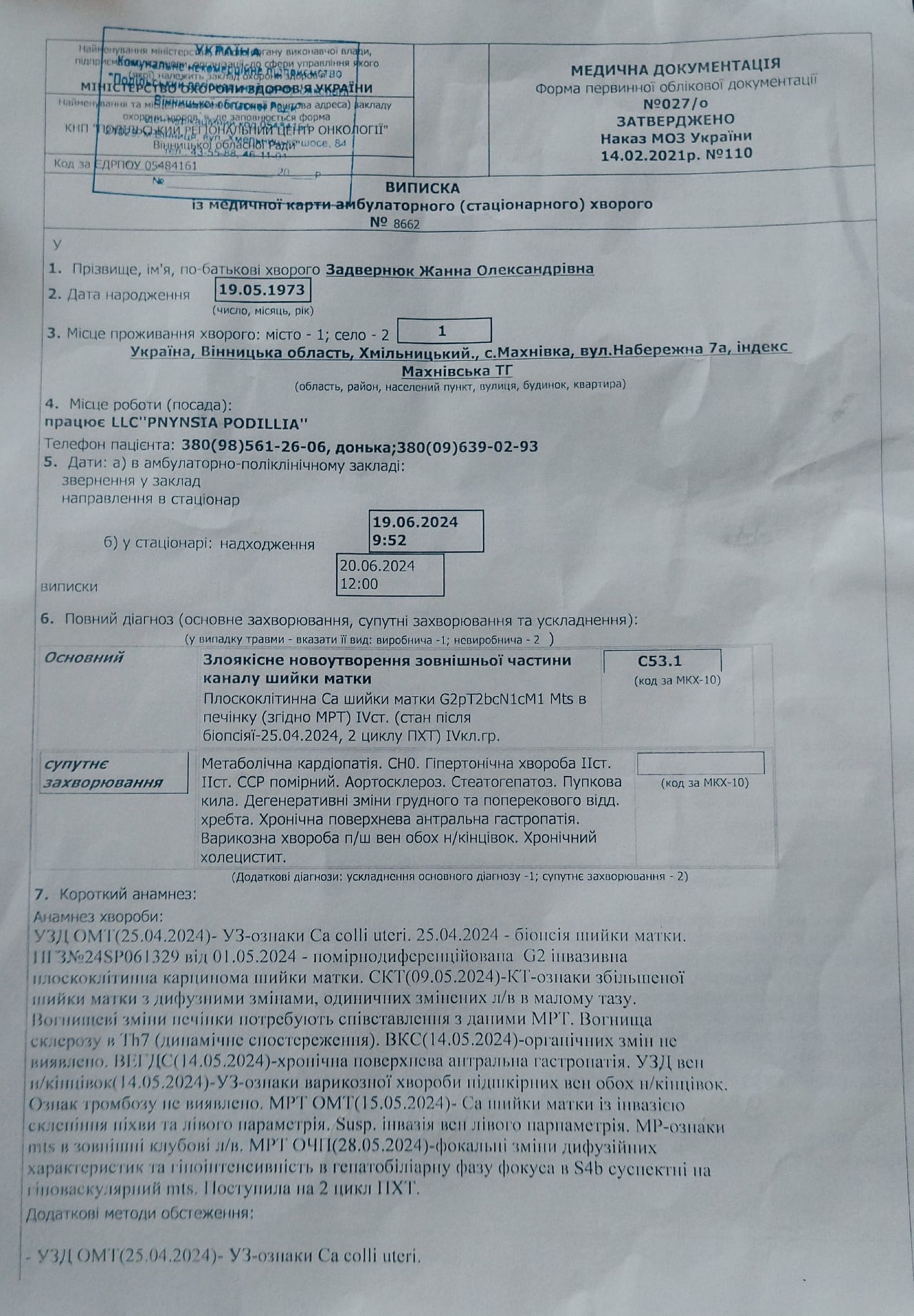 Діагноз: Ca шийка матки G2 pT2bN1M1 4ст.2кл( mts в печінку)