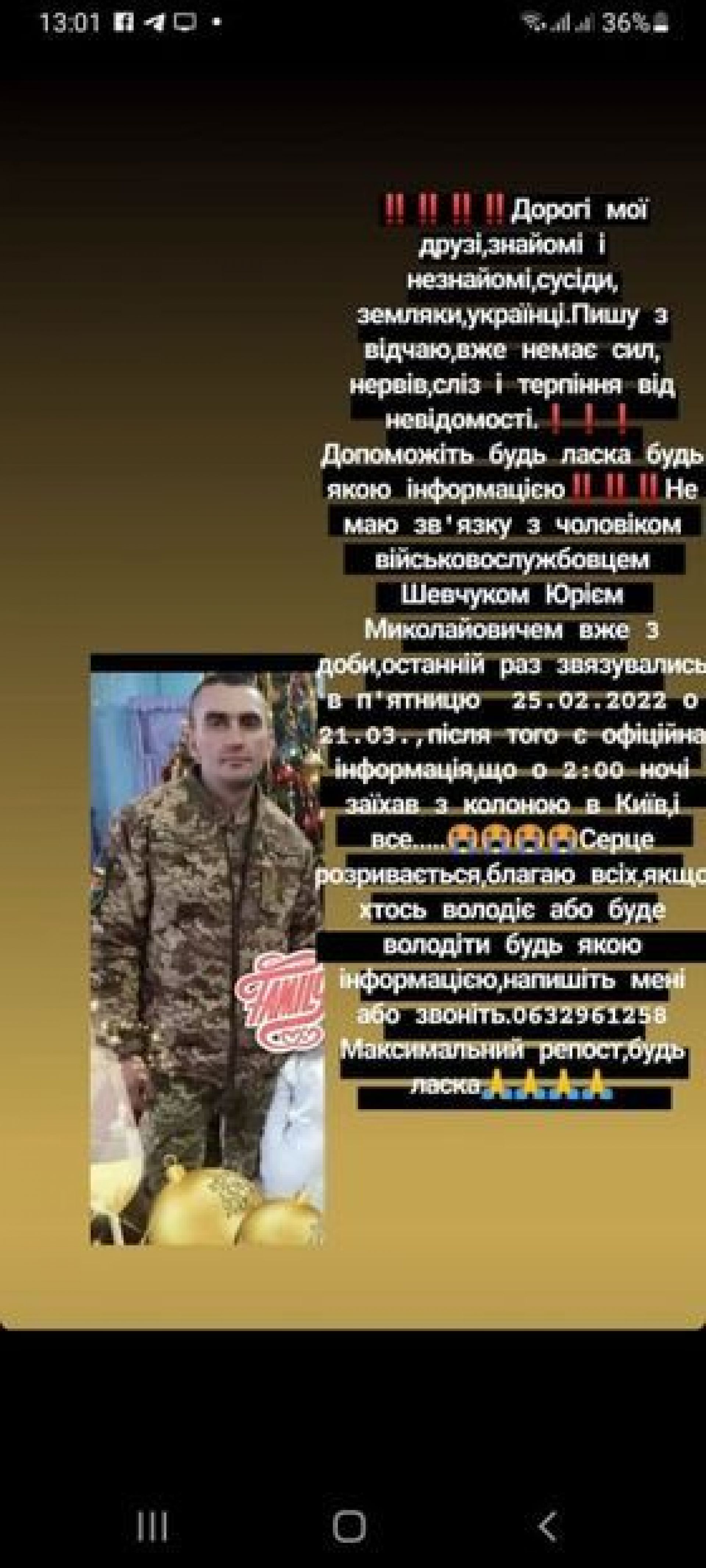 « Є офіційна інформація, що заїхав з колоною в Київ,і все. Серце розривається, благаю всіх,якщо хтось володіє або буде володіти будь якою інформацією,напишіть мені або дзвоніть. 0632961258» — написали нам у групу RIA у ФБ