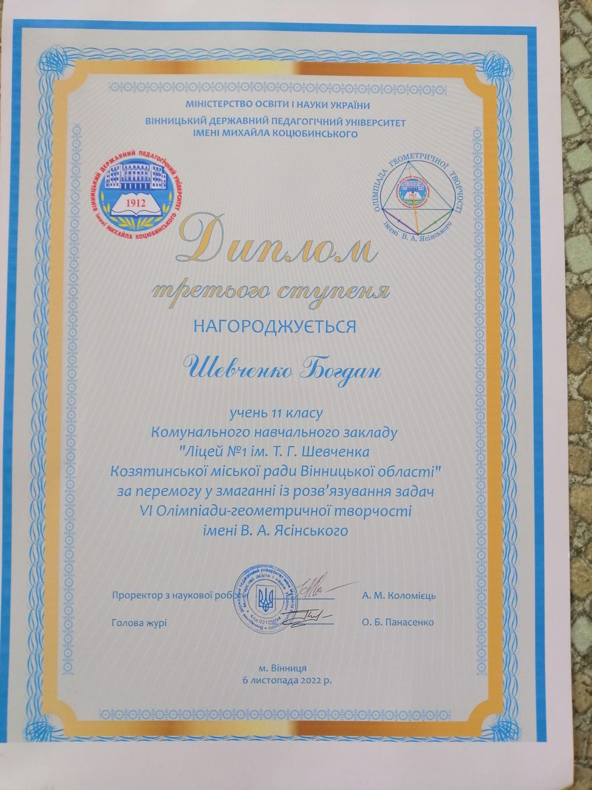 - Козятинчанин, учень 11 класу Богдан Шевченко став переможцем. Хлопця нагородили дипломом ІІІ ступеня за перемогу у змаганні із розв'язування задач