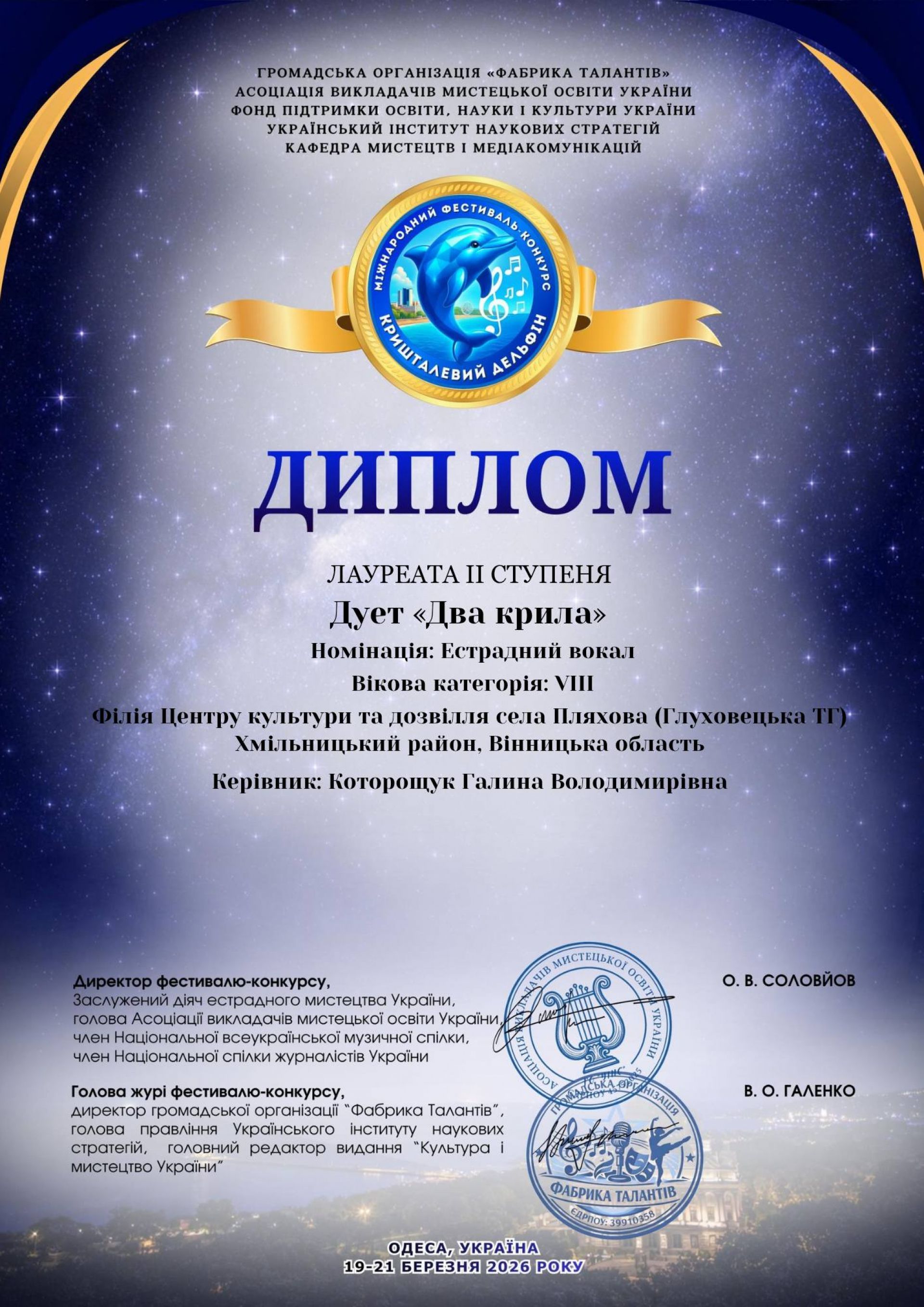 - Дует «Два крила» та Олександр Зайчук взяли участь у Міжнародному фестивалі-конкурсі «Кришталевий дельфін» і продемонстрували високий рівень майстерності та таланту